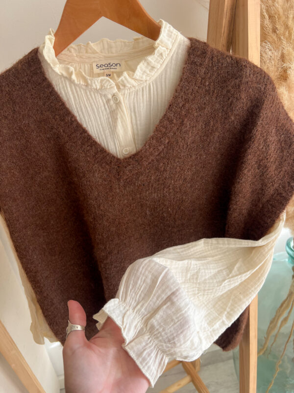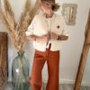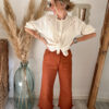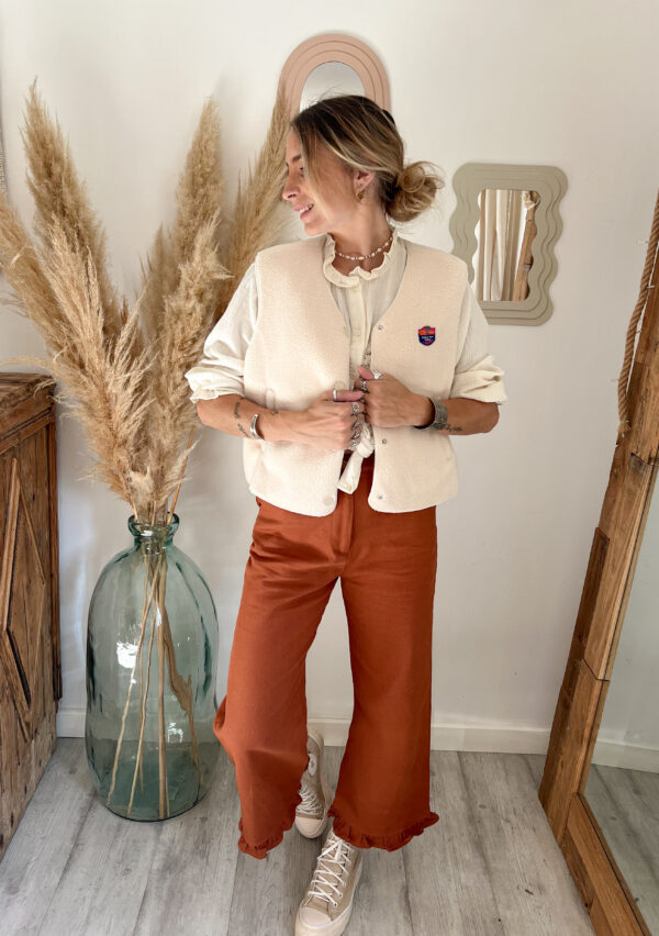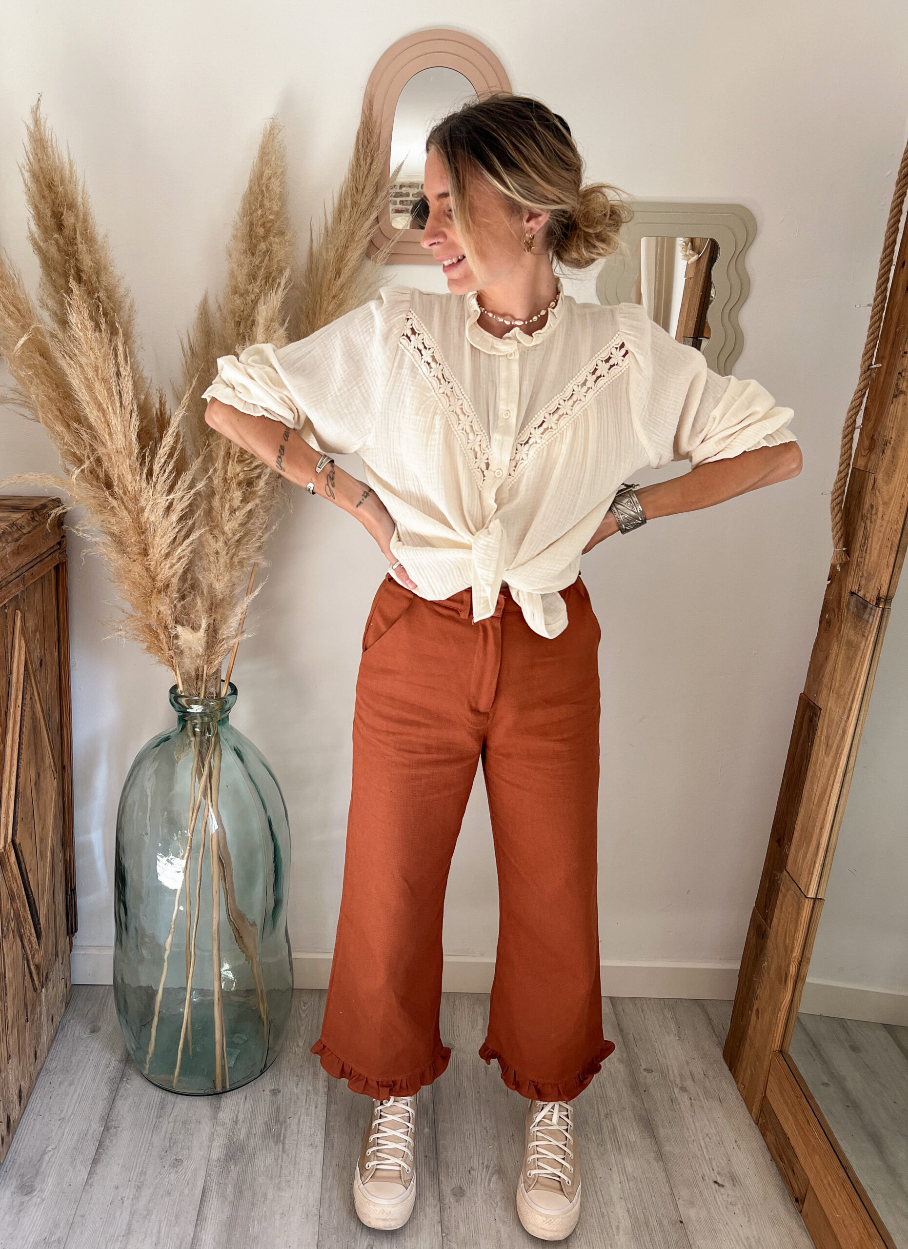La chemise Soline se marie merveilleusement bien avec des pièces fortes comme avec des basiques. Associée au pantalon rouille Alva, elle crée un contraste lumineux : l’écru adoucit le rouille, tandis que la broderie apporte une vraie finesse au look. Sous le pull chocolat Cléo, son col volanté et ses manches texturées ressortent parfaitement, créant une superposition chaude mais élégante.