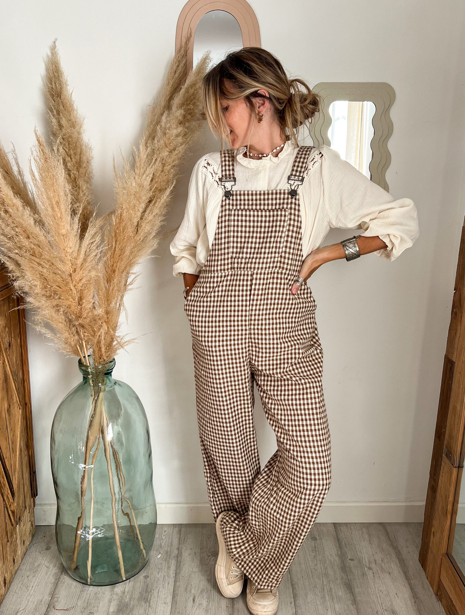 Enfin, une des combinaisons les plus appréciées reste celle avec la salopette Charlie : la gaze de coton se glisse parfaitement sous la salopette, la broderie ressort à merveille et l’ensemble donne un style rétro-bohème très naturel, facile à porter au quotidien.