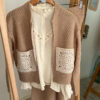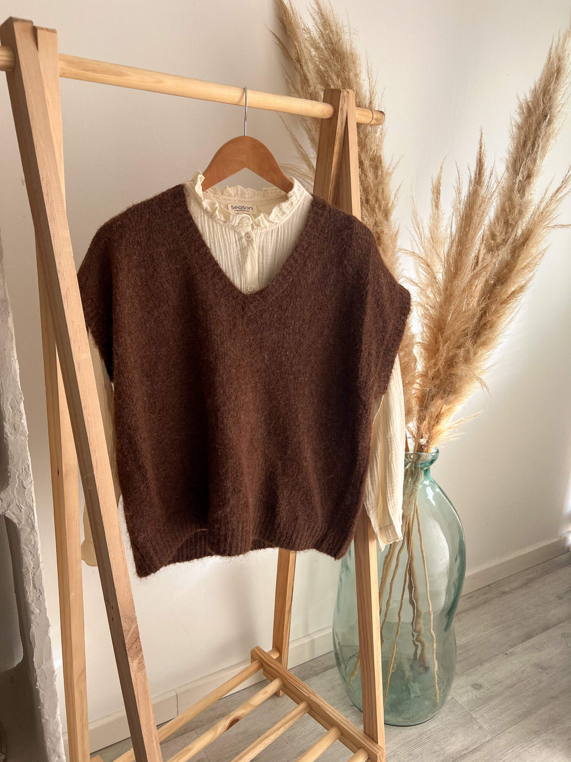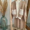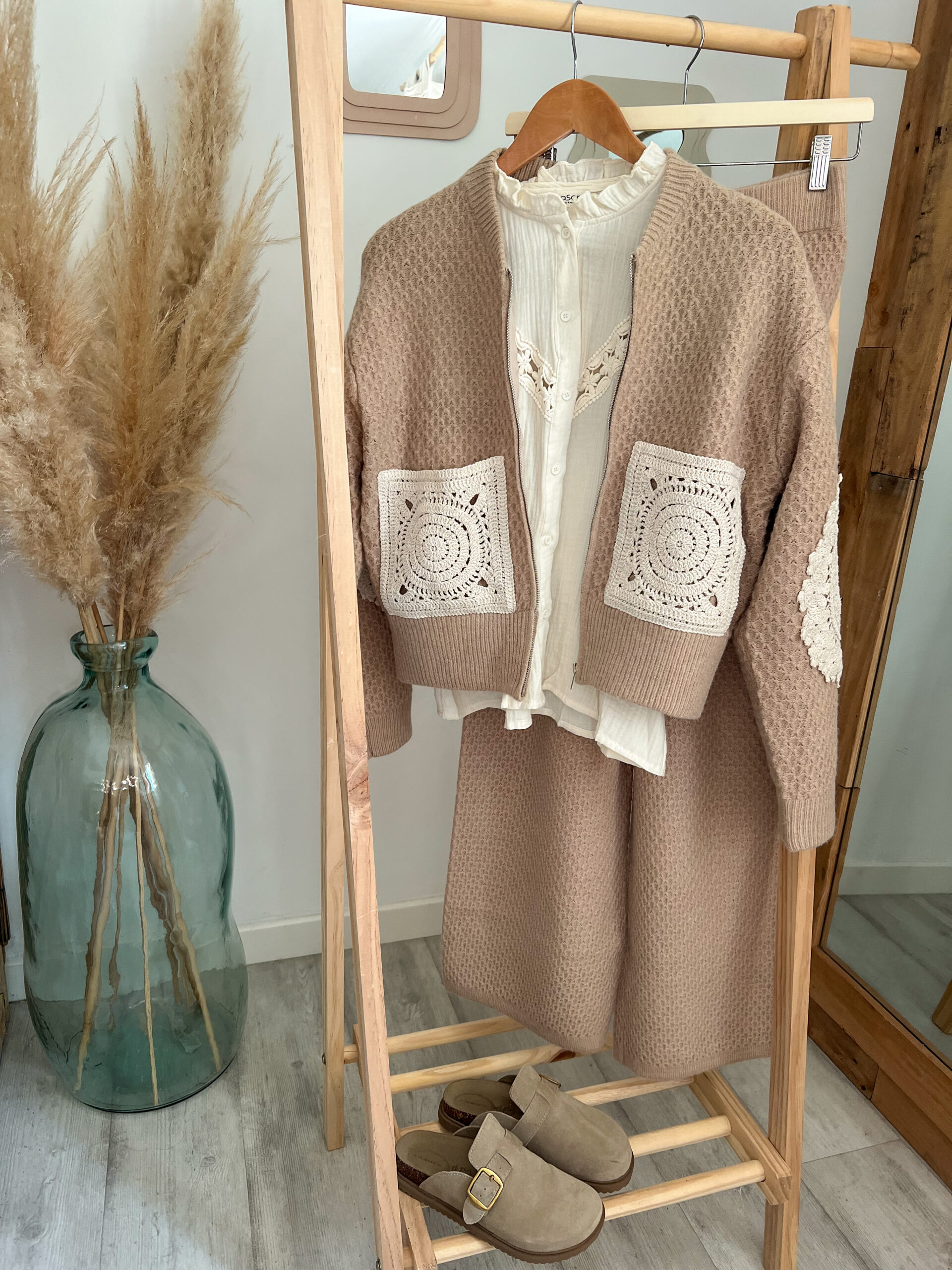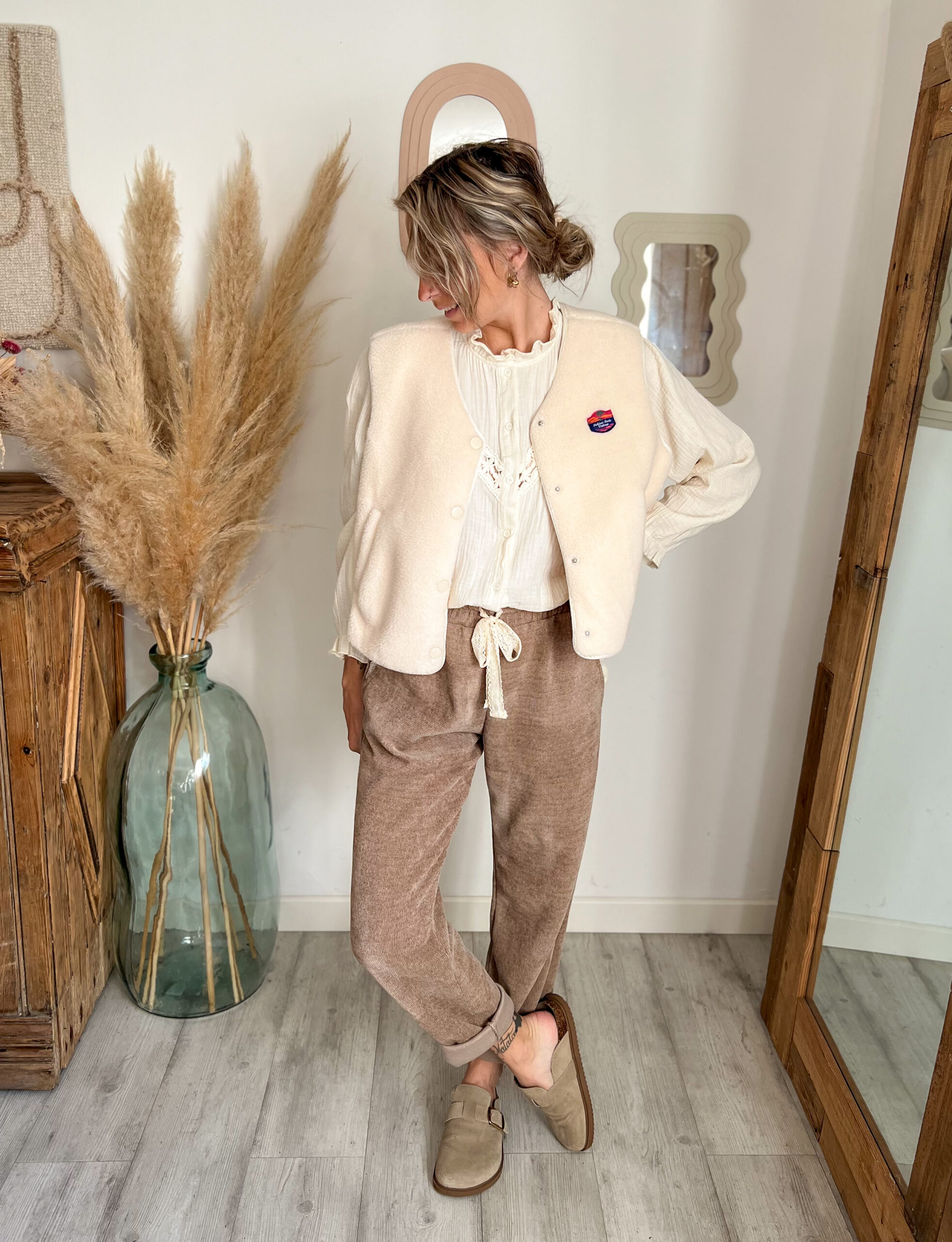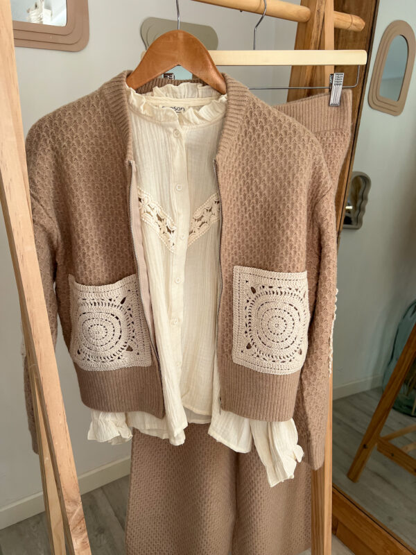 Elle fonctionne aussi à merveille avec le gilet sans manches Malo crème, qui renforce le côté cocooning tout en laissant visibles les détails brodés. Avec l’ensemble Saël en maille, elle apporte une touche plus légère et féminine qui équilibre la matière plus dense.