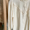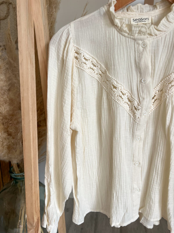 Le détail qui la rend unique, c’est son empiècement brodé façon dentelle, positionné en V sur le buste. Cette broderie structure la silhouette, illumine le haut du corps et ajoute la touche féminine idéale. Son col volanté, discret et élégant, renforce cette douceur sans en faire trop, ce qui permet de l’associer à des looks très différents selon l’envie.