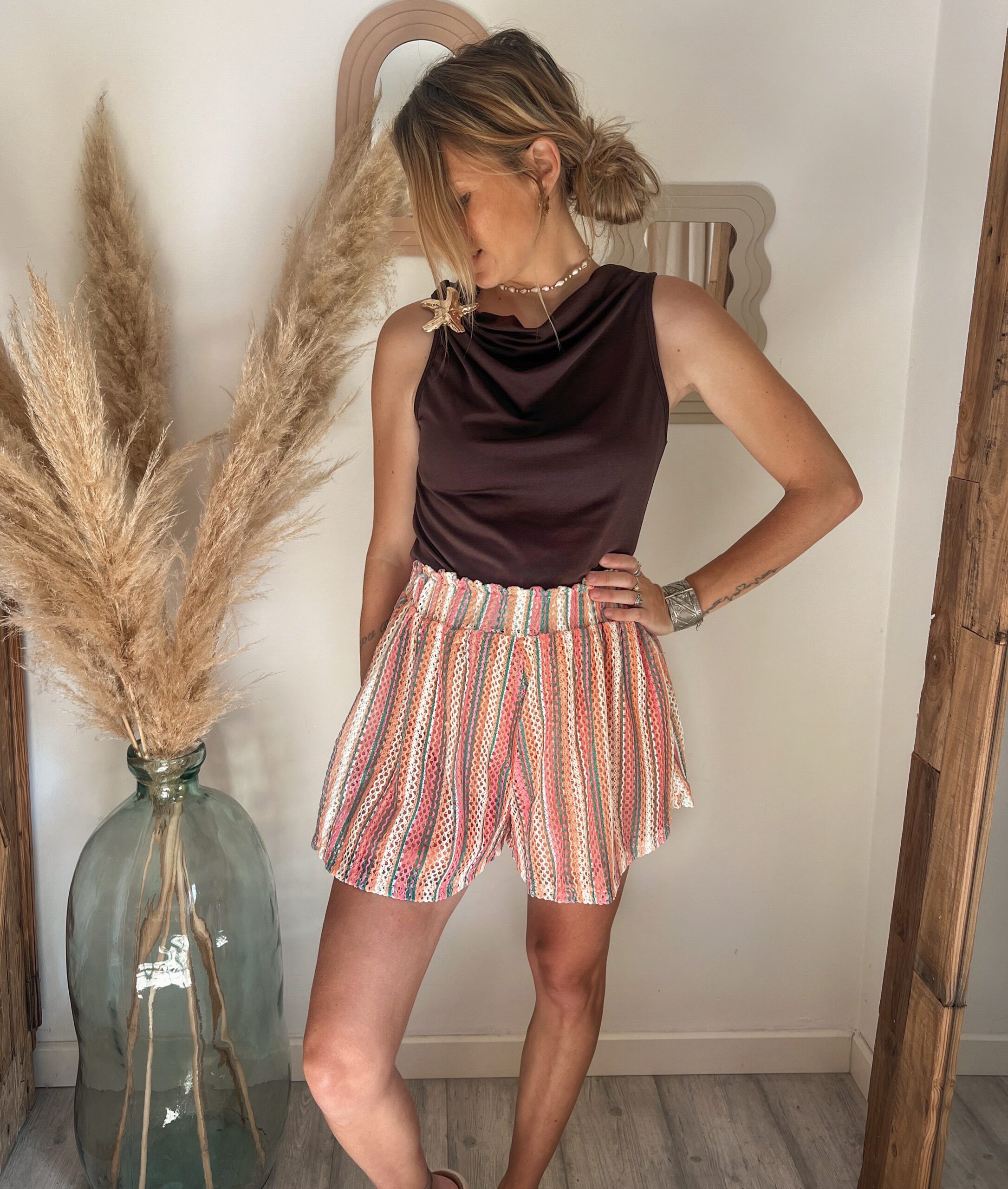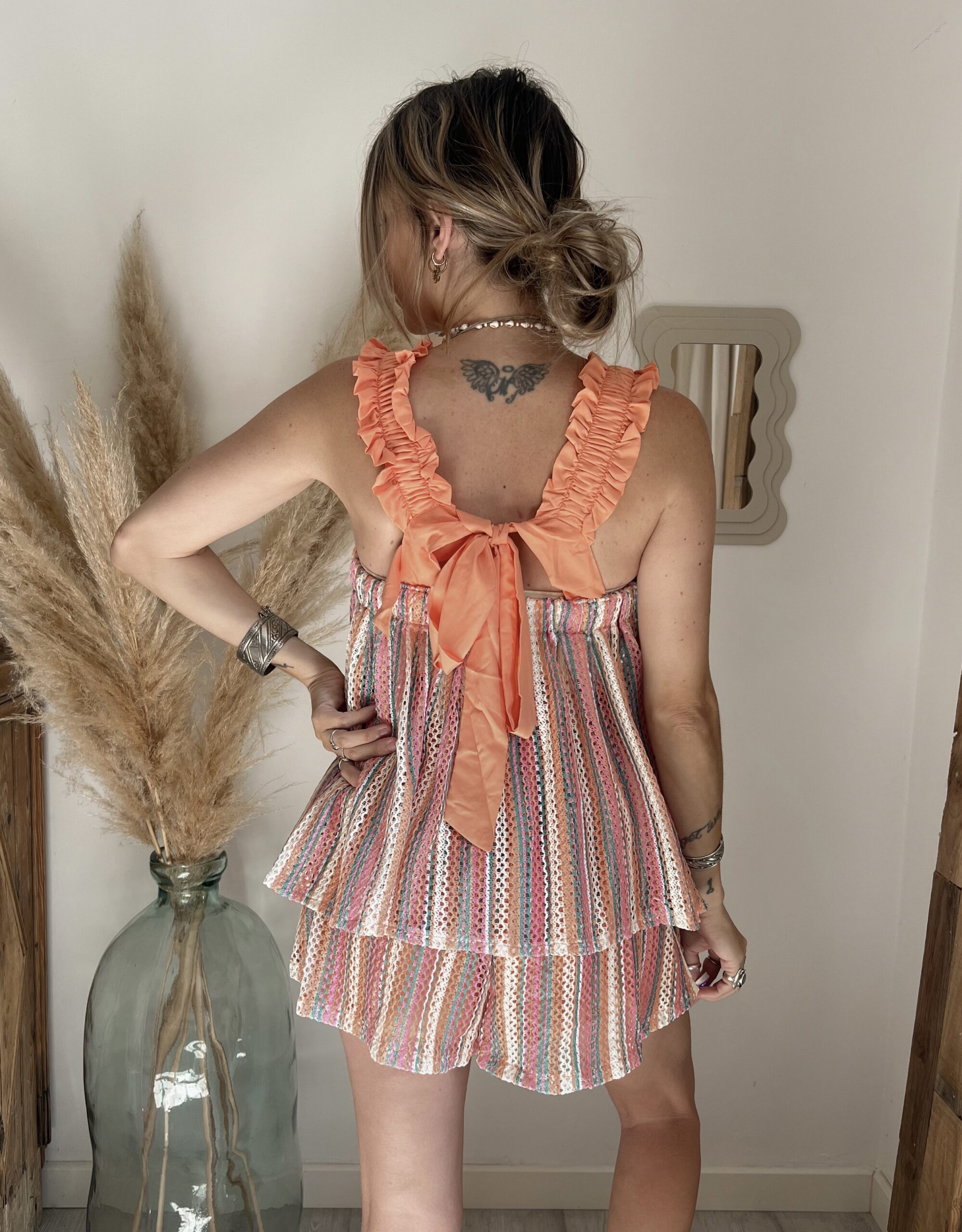 Le top Cala se distingue par ses larges bretelles volantées qui encadrent délicatement les épaules. Dans le dos, un grand nœud orangé vient nouer la silhouette et apporte une touche pleine de charme et de féminité. Ce détail raffiné fait toute la différence et donne au top son allure solaire et unique. Les fines rayures multicolores, relevées d’une subtile texture ajourée, renforcent le côté lumineux et pétillant de la pièce. Fluide et aérien, le top se porte aussi bien pour une promenade estivale qu’en superposition sur un maillot de bain ou un bandeau, comme le porte ici le modèle. Le short assorti, léger et ample, complète parfaitement cet ensemble. Entièrement doublé, il offre plus de confort et de tenue. Sa coupe fluide garantit une liberté de mouvement idéale, tout en conservant un tombé élégant. Il peut également se porter seul, associé au débardeur Selva chocolat ou à un simple t-shirt uni, pour un look plus minimaliste mais toujours tendance.