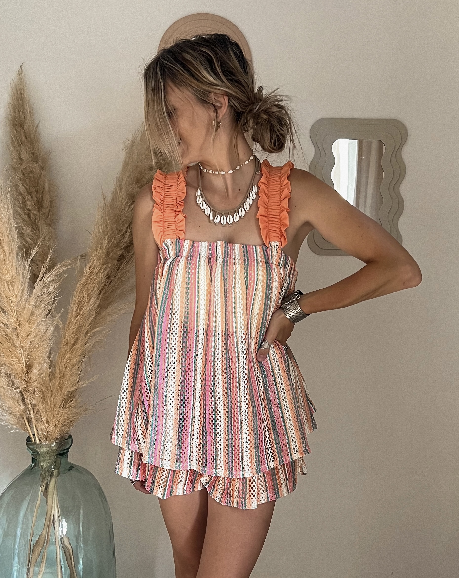 Un vent de fraîcheur souffle avec l’ensemble Cala femme short top fluide rayé, une tenue qui respire l’été et la bonne humeur. Composé d’un haut fluide à volants orangés et d’un short ample, il allie confort, féminité et légèreté dans un duo pensé pour toutes vos journées estivales.