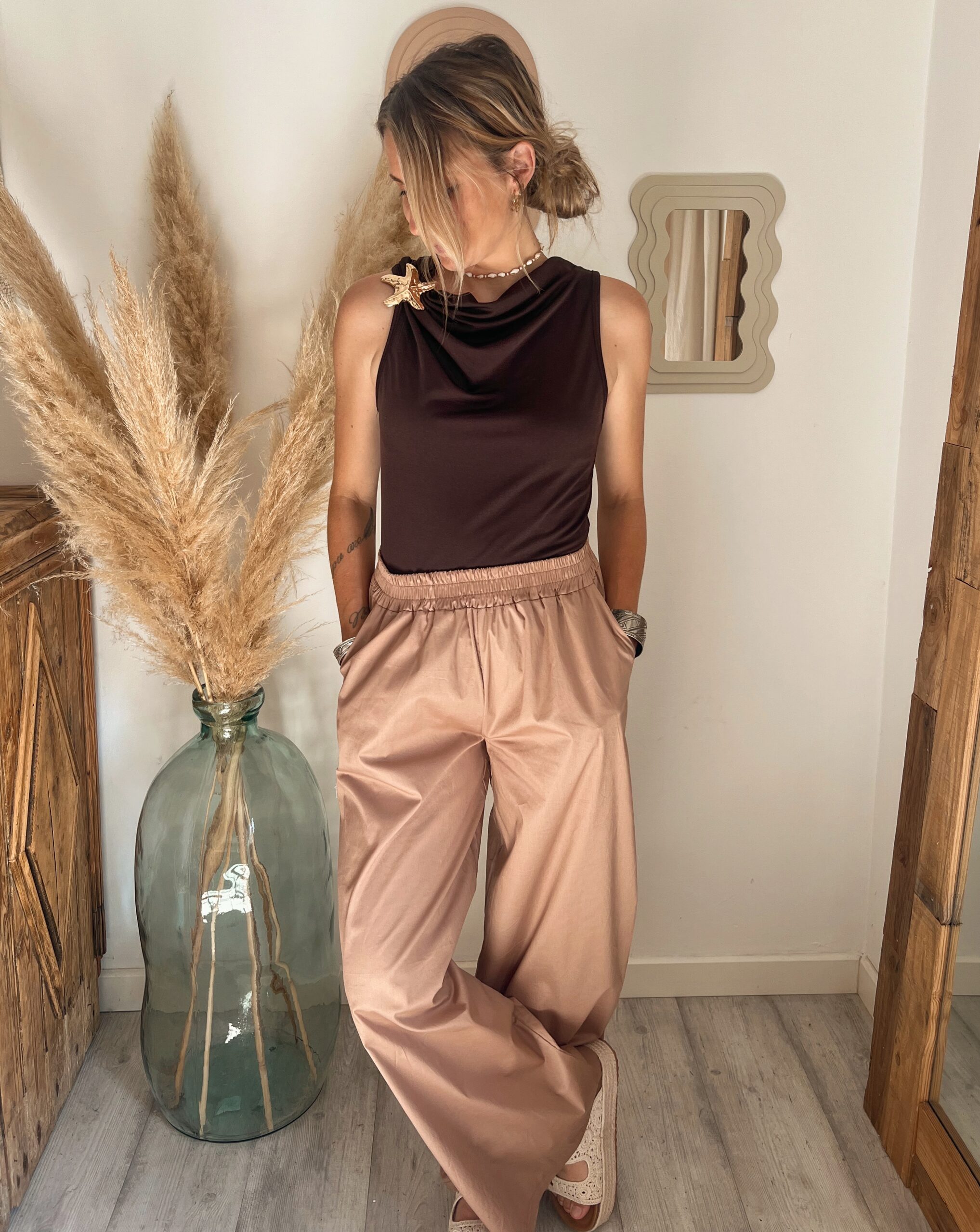 Le pantalon fluide Siena, doté d’une taille élastiquée, accompagne vos mouvements avec souplesse et légèreté. Sa coupe large flatte toutes les morphologies et assure un confort idéal, du 34 au 42. Il se marie naturellement à la chemise assortie, mais peut aussi se porter séparément avec d’autres pièces de la collection Moonbow, comme le débardeur Selva chocolat ou la chemise Flavia pour un mix & match sans faute de goût.