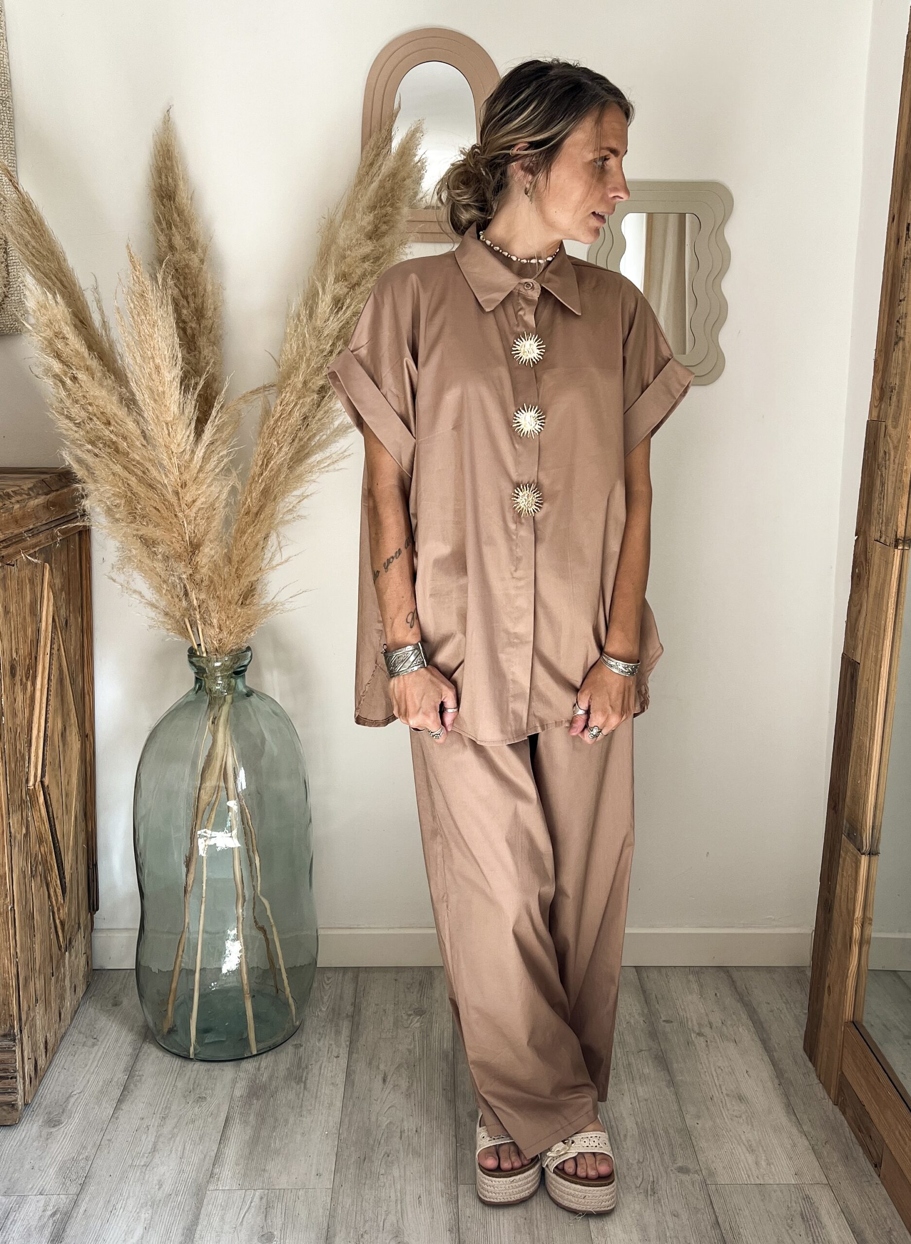 Siena, c’est le parfait équilibre 🌞 : une chemise oversize illuminée de broches soleil dorées et un pantalon fluide qui sublime la silhouette. Taille unique 34-42.