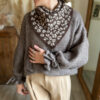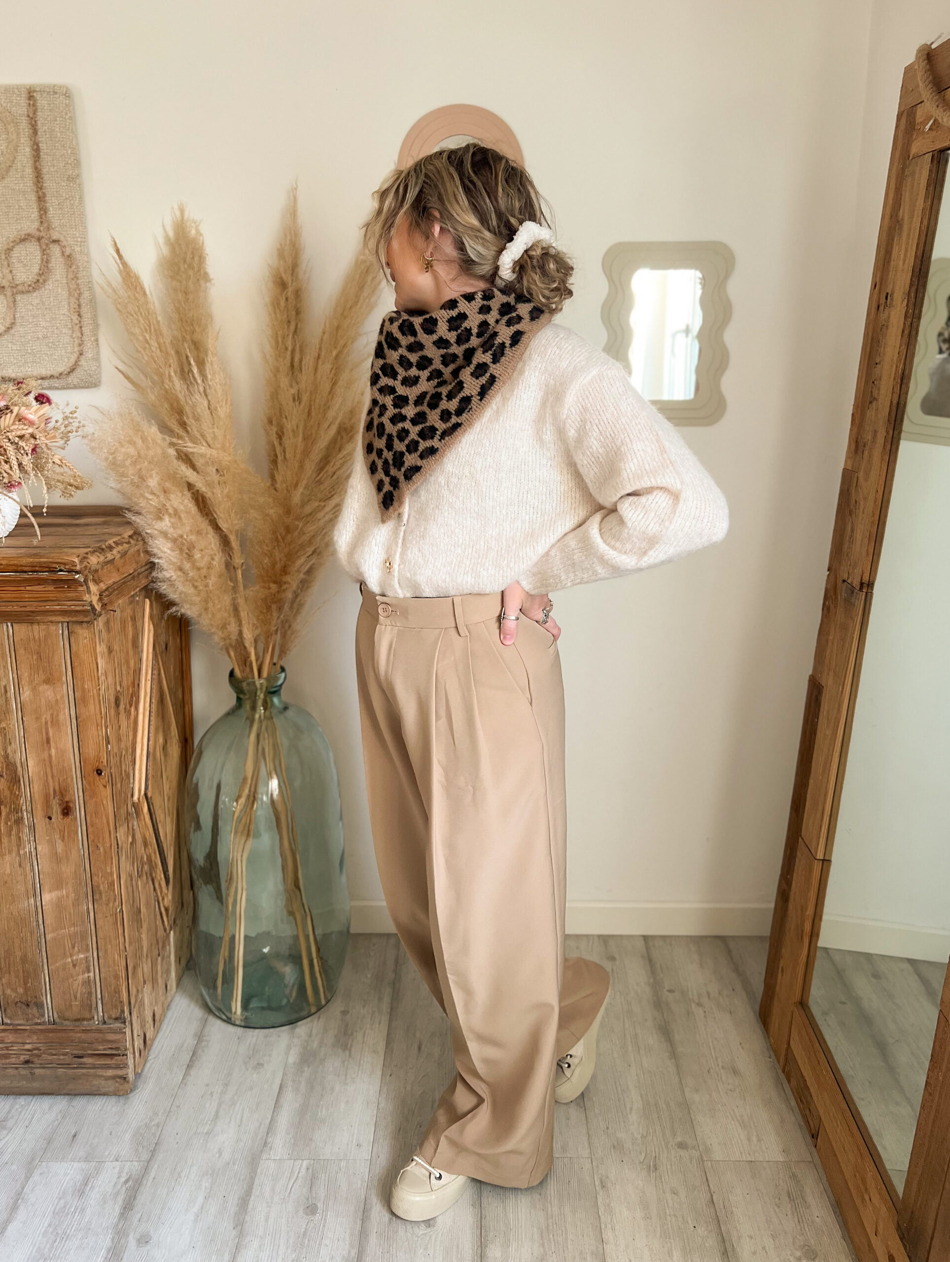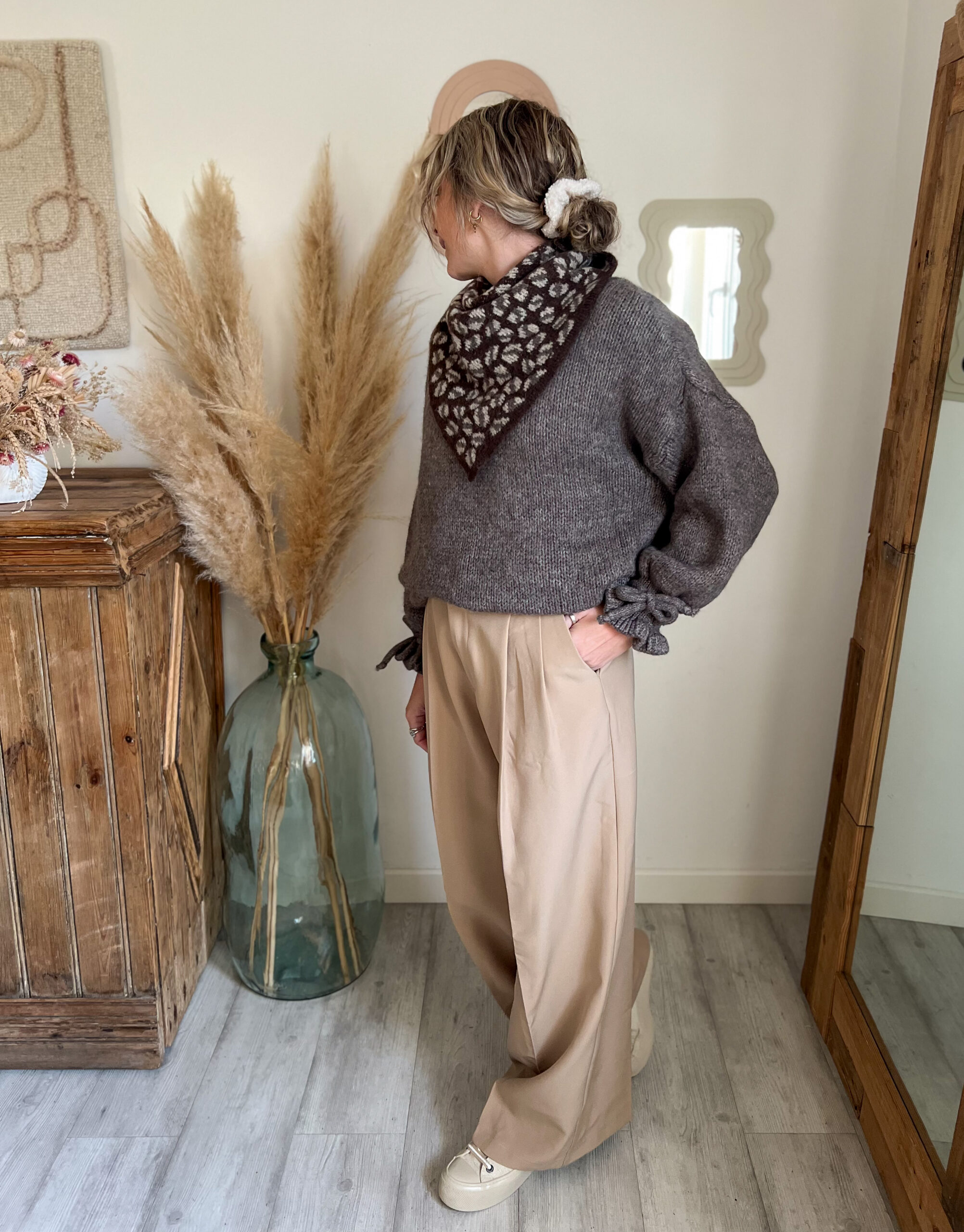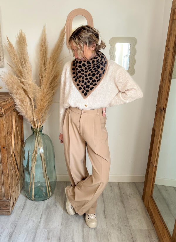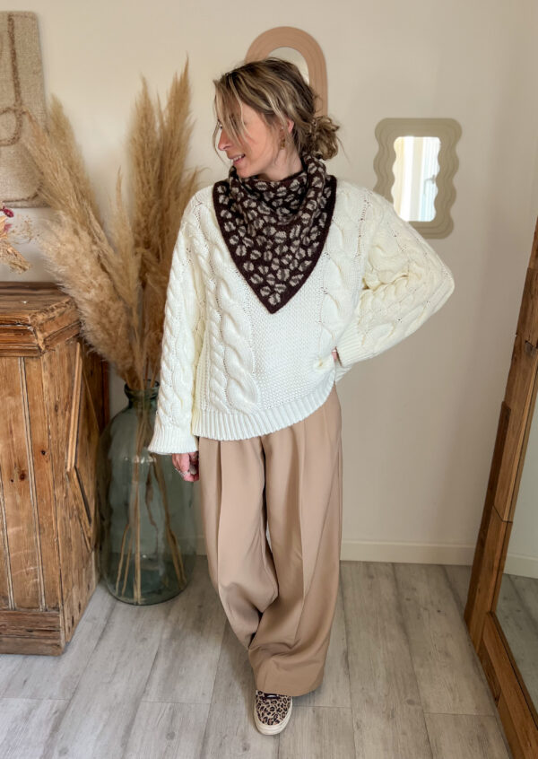 Tricoté dans une maille épaisse, il apporte un vrai côté cocooning sans être trop volumineux. La maille est douce au toucher, agréable sur la peau, et tient parfaitement en place autour du cou. Sa particularité, c’est sa forme légèrement triangulaire qui offre deux façons différentes de le porter : version “devant” pour un style plus classique et structuré, ou version “dos” avec la pointe dans le dos pour un rendu plus moderne, presque bohème. Les deux styles fonctionnent à merveille et transforment instantanément une tenue simple en un look travaillé.