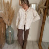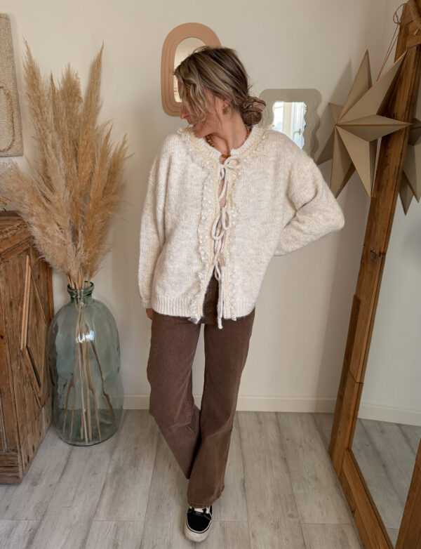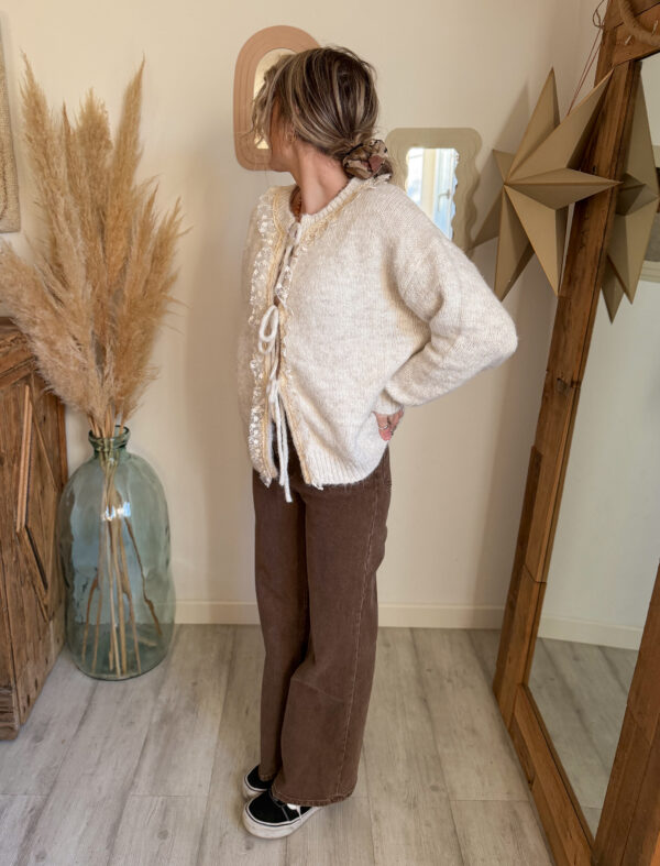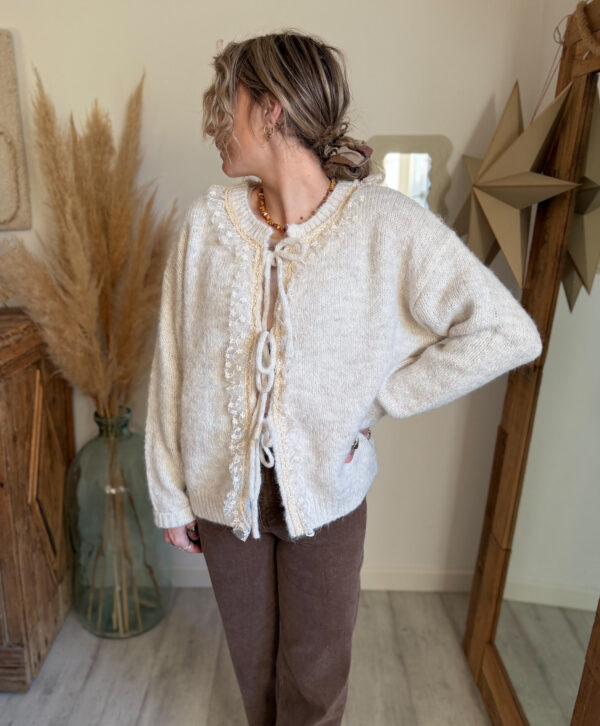 Ce gilet en maille dentelle femme se distingue par ses détails délicats en dentelle, qui viennent subtilement souligner l’encolure et la patte de boutonnage. Ces finitions apportent une vraie touche de féminité et de douceur, tout en restant faciles à porter au quotidien. Les liens à nouer sur le devant permettent d’ajuster le gilet selon vos envies : fermé pour un look structuré, ou légèrement ouvert pour une allure plus naturelle et fluide.