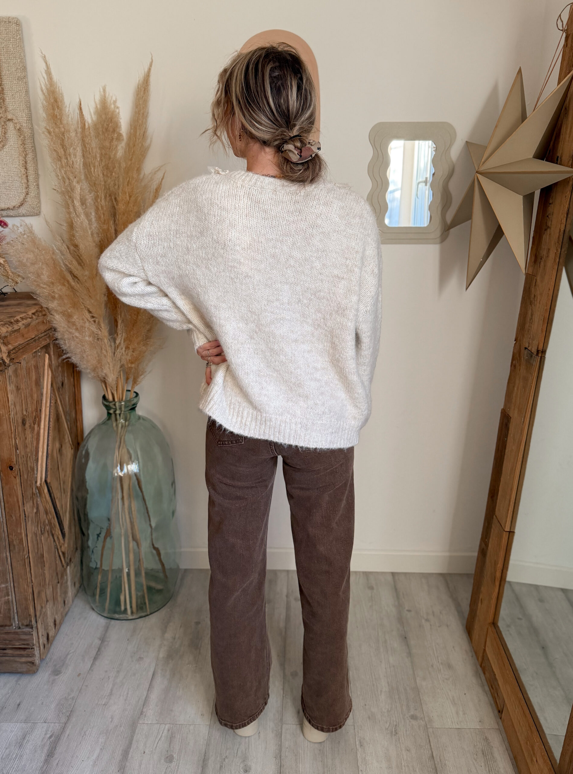 Le gilet ALBA est une pièce particulièrement polyvalente. Il se porte aussi bien sur un simple top qu’en superposition sur une blouse ou un tee-shirt. Pour un look harmonieux et dans l’esprit Moonbow, il s’associe parfaitement au jean ZOA, avec lequel il crée une silhouette équilibrée, confortable et très tendance. Cette association fonctionne aussi bien pour une tenue du quotidien que pour une allure plus soignée, selon les accessoires choisis.