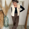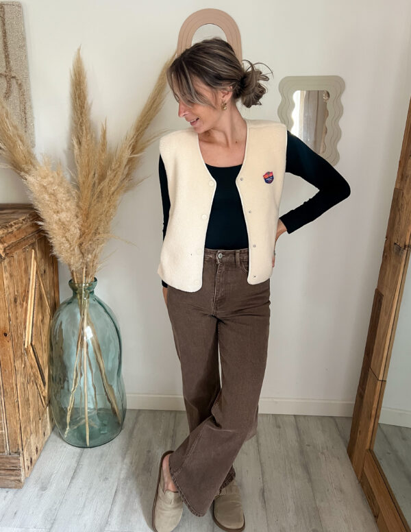 – Il se marie aussi à merveille avec le pantalon NOA, en velours écru ton sur ton, pour un rendu plus épuré et monochrome et délicat