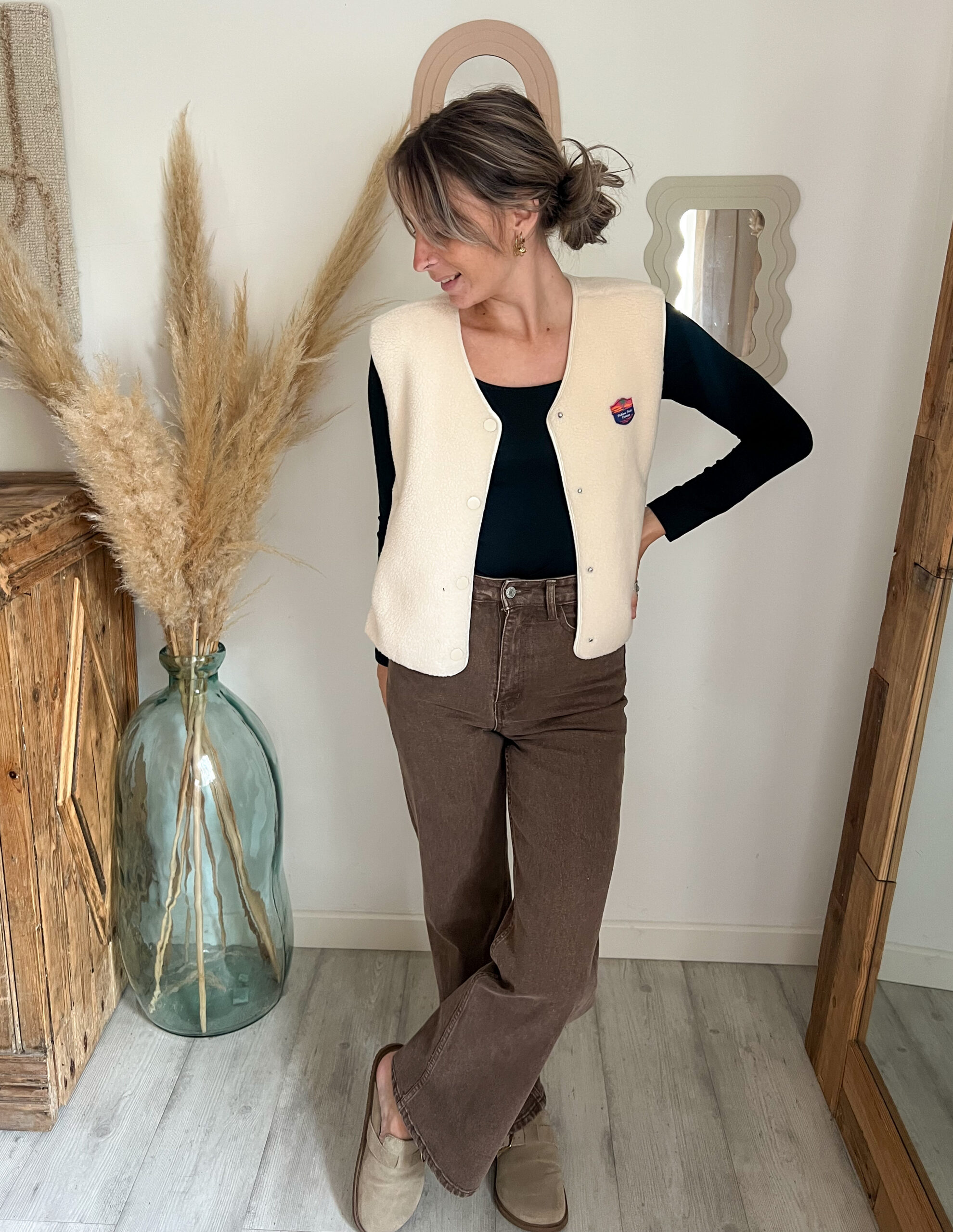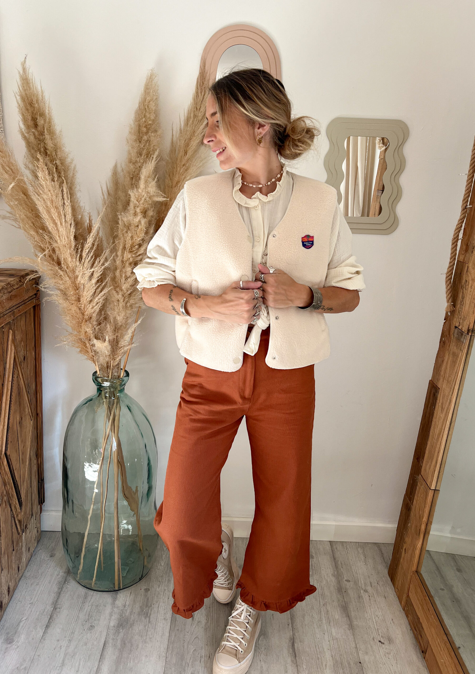– Avec le pantalon Alva, sa teinte rouille qui vient sublimer la douceur du beige, pour un contraste automnal chaleureux.
