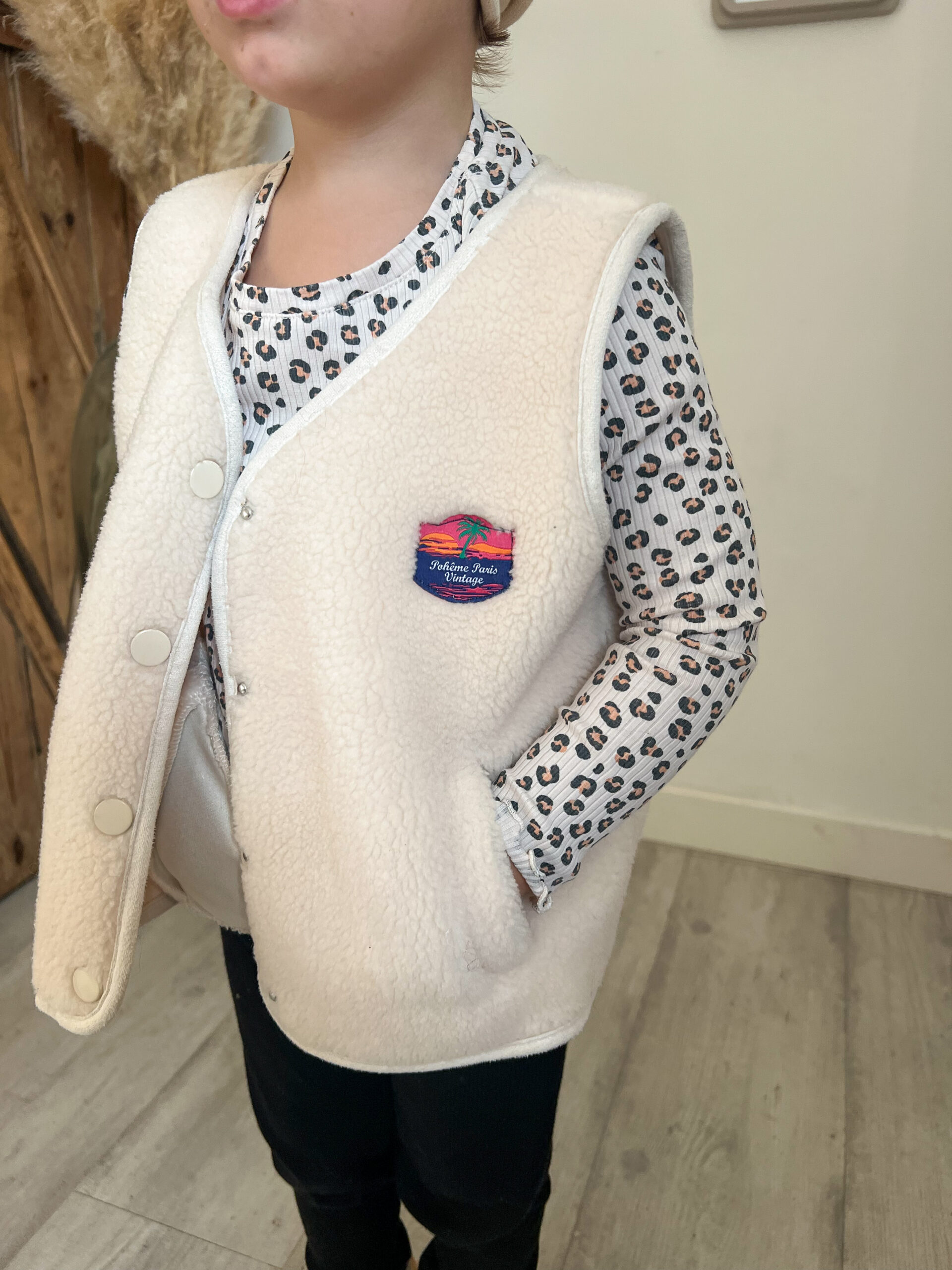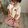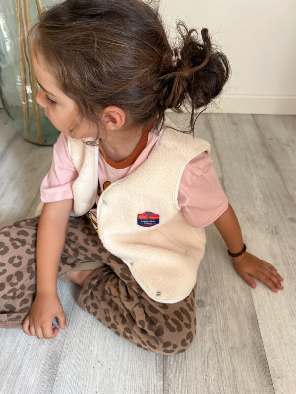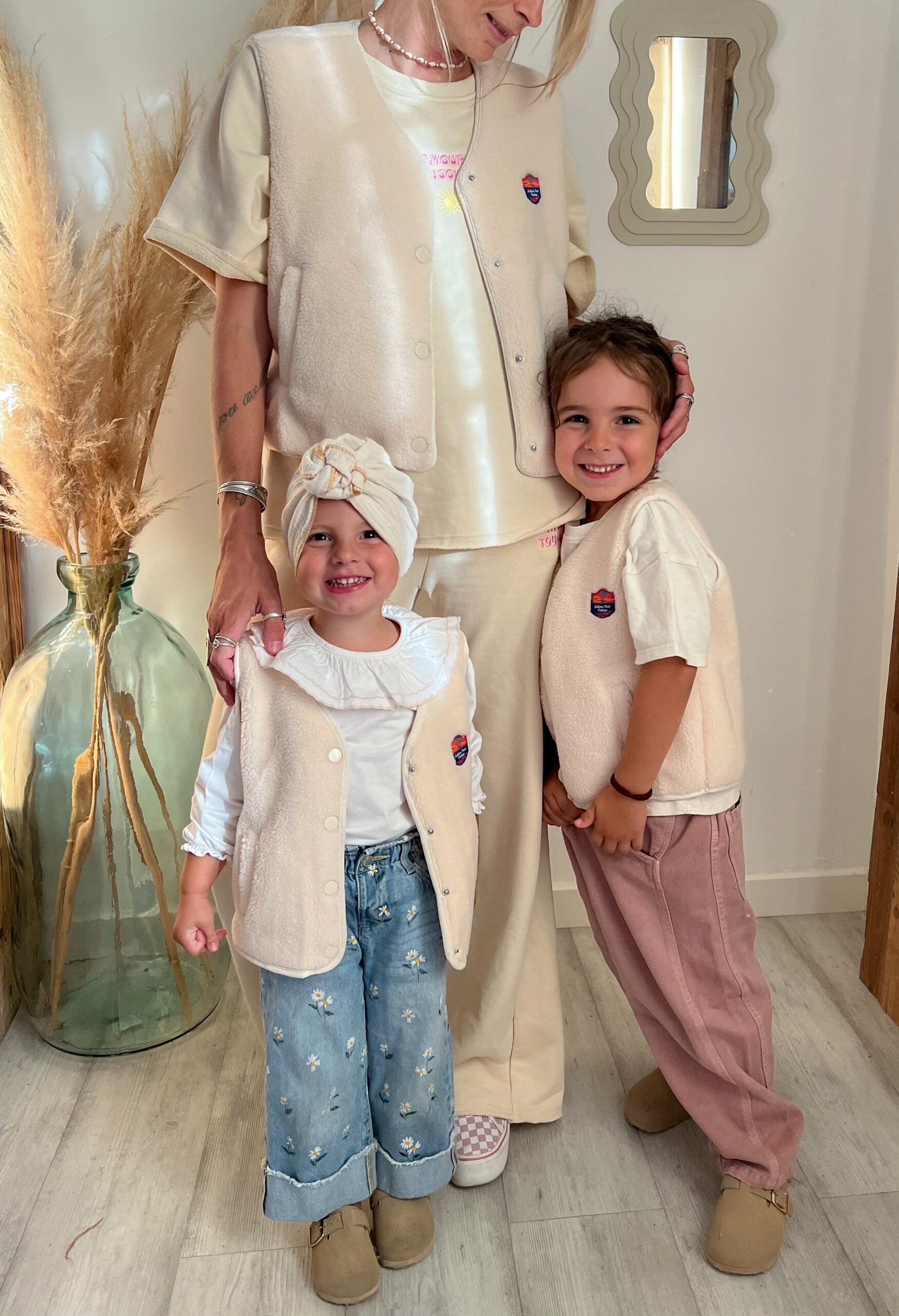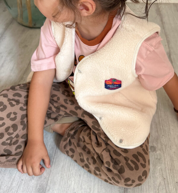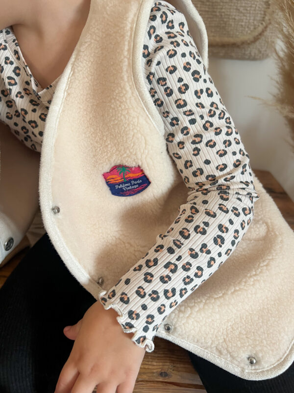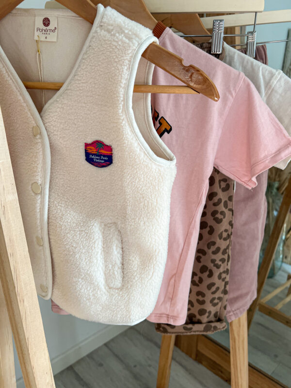 Le gilet sherpa enfant matchy séduit aussi par ses jolis détails : boutons-pression ton sur ton à l’avant, poches discrètes, et un écusson brodé esprit vintage qui rappelle la signature du modèle adulte.