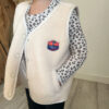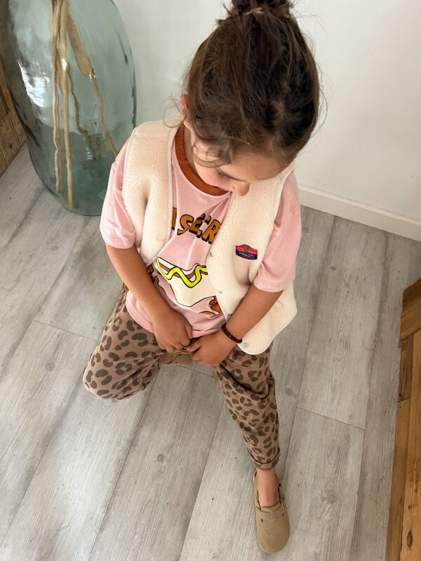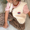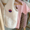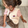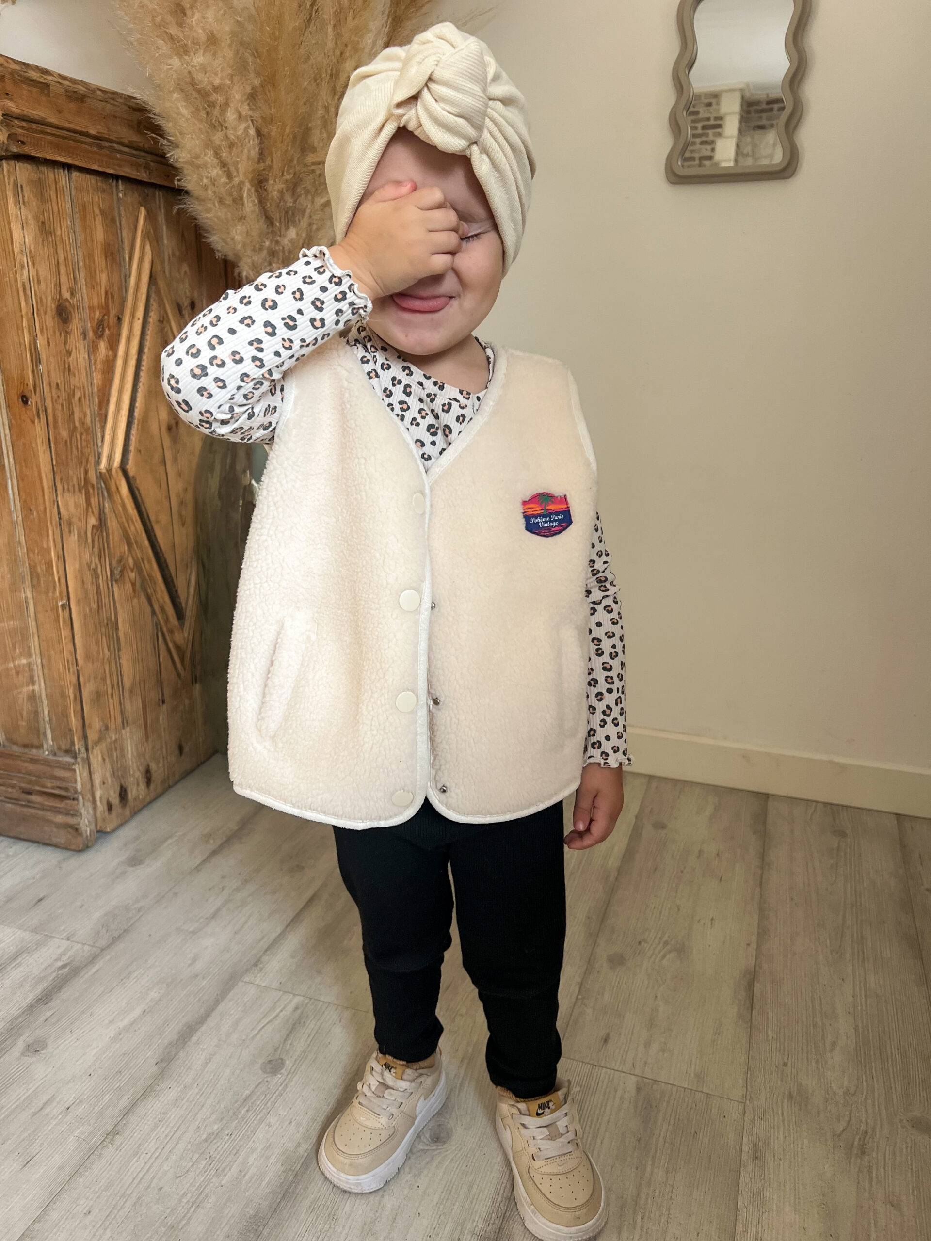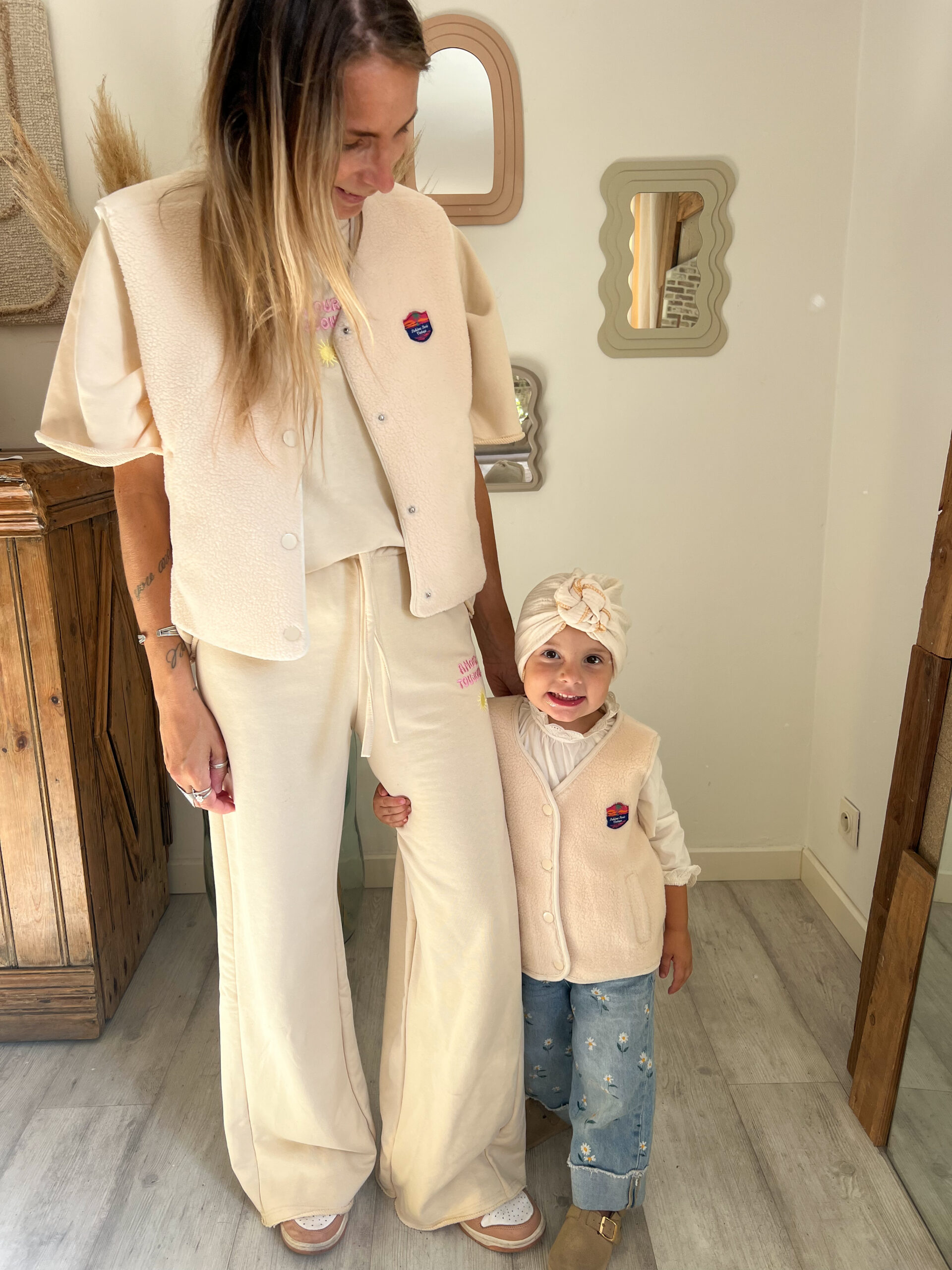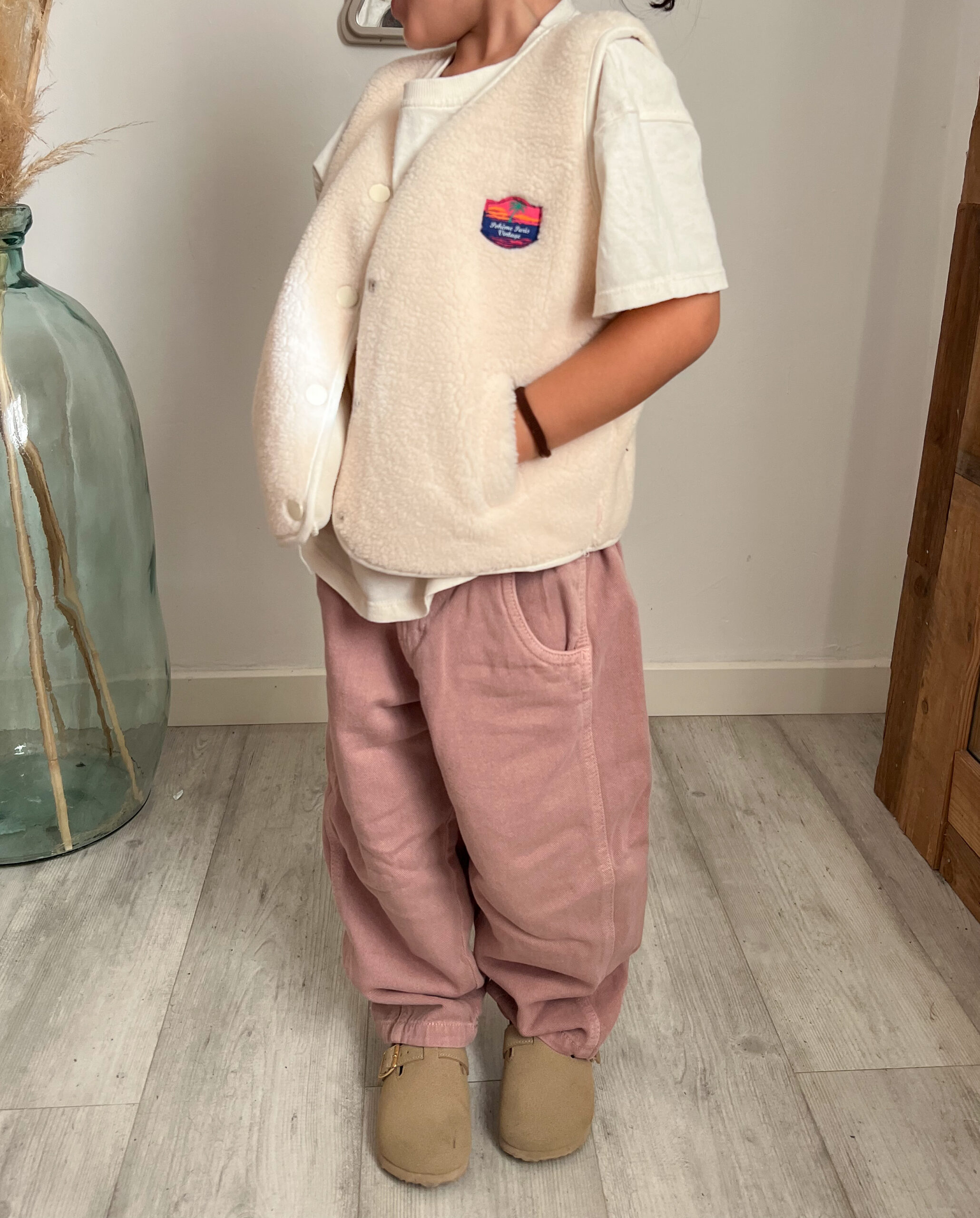 Le gilet sherpa enfant matchy séduit aussi par ses jolis détails : boutons-pression ton sur ton à l’avant, poches discrètes, et un écusson brodé esprit vintage qui rappelle la signature du modèle adulte.