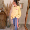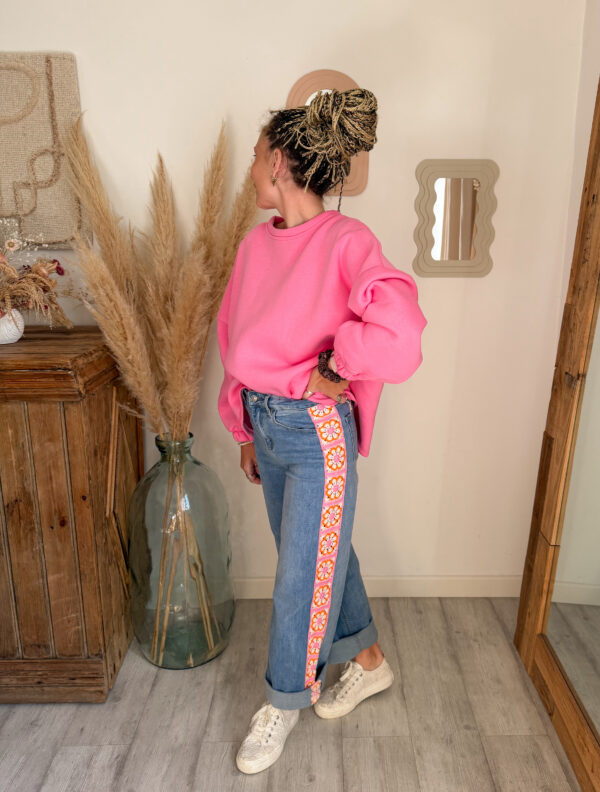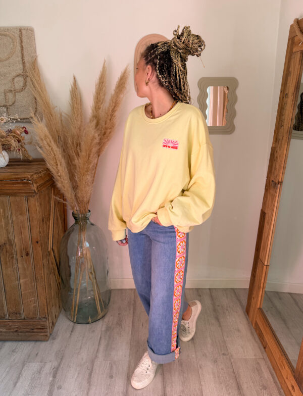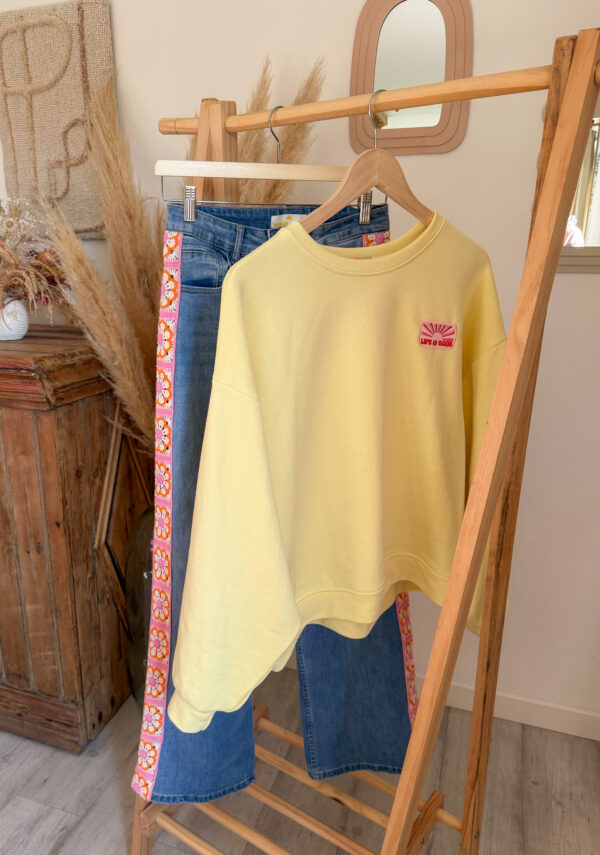Côté style, ce jean femme bohème broderie est très facile à associer avec de nombreuses pièces du dressing. Il se marie particulièrement bien avec le sweat rose à manches courtes SOLEA, pour un look doux et féminin. Pour une tenue encore plus lumineuse, il s’accorde également très bien avec le sweat jaune pastel ELIO.