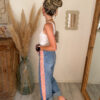 Le modèle sur les photos mesure 1m63. Avec des chaussures plates, elle replie légèrement le bas du jean pour un rendu plus harmonieux. En revanche, avec des chaussures compensées ou des talons, le jean peut être porté déplié pour allonger la silhouette.