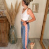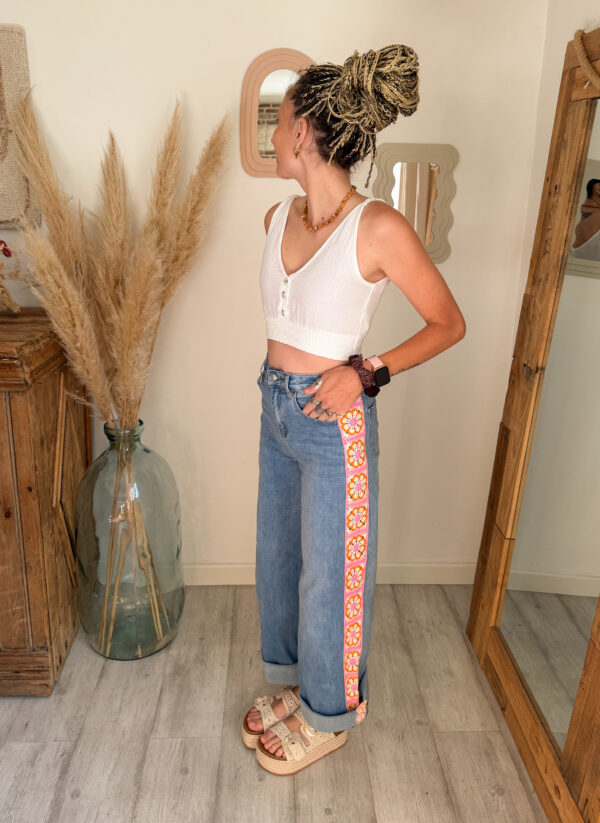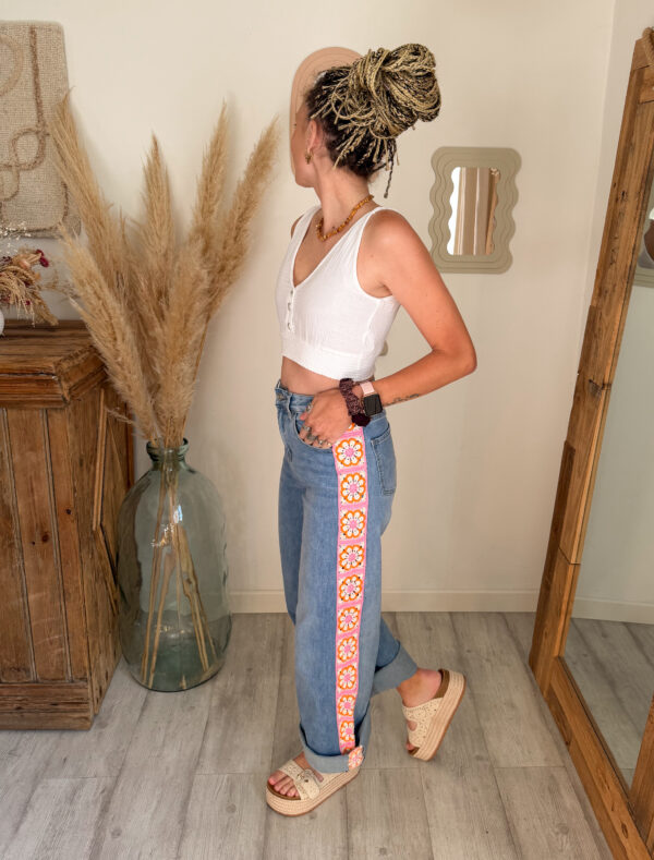 Ce jean femme bohème broderie se distingue par son joli détail fleuri sur le côté. La bande brodée apporte une touche colorée et lumineuse qui donne du caractère au jean tout en gardant un esprit doux et féminin. C’est ce petit détail qui fait toute la différence et qui transforme un jean basique en une pièce originale du dressing.