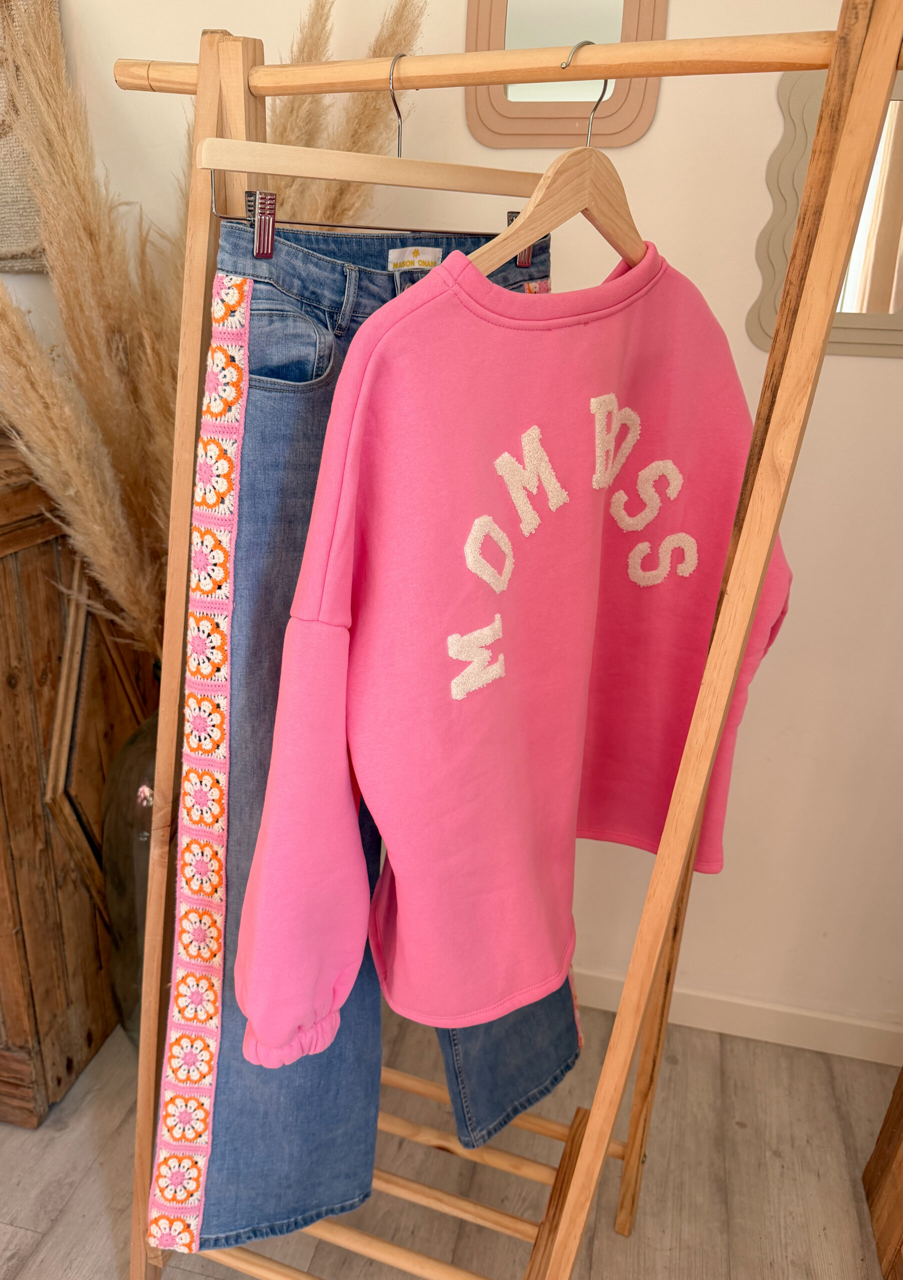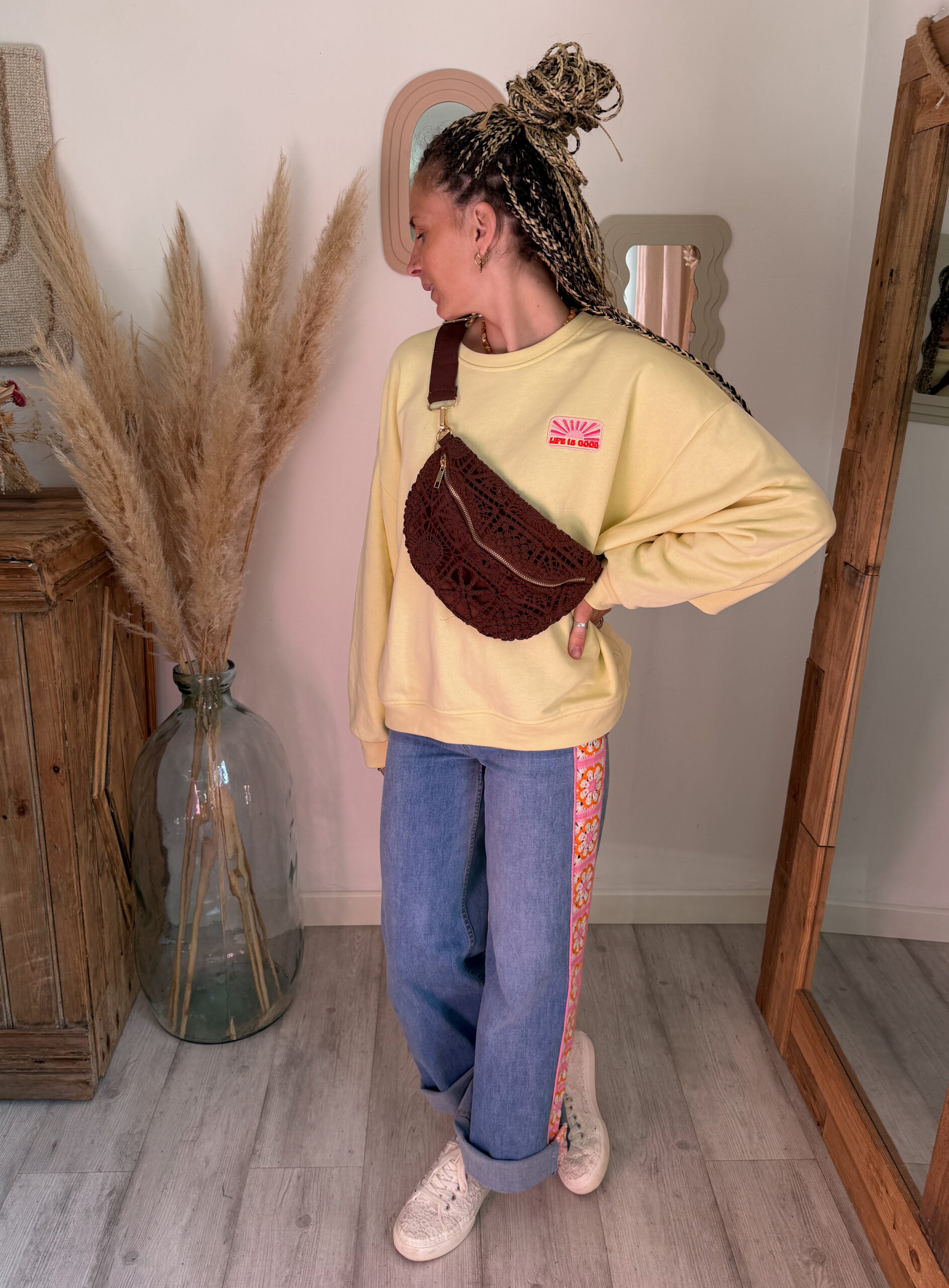 Côté style, ce jean femme bohème broderie est très facile à associer avec de nombreuses pièces du dressing. Il se marie particulièrement bien avec le sweat rose à manches courtes SOLEA, pour un look doux et féminin. Pour une tenue encore plus lumineuse, il s’accorde également très bien avec le sweat jaune pastel ELIO.