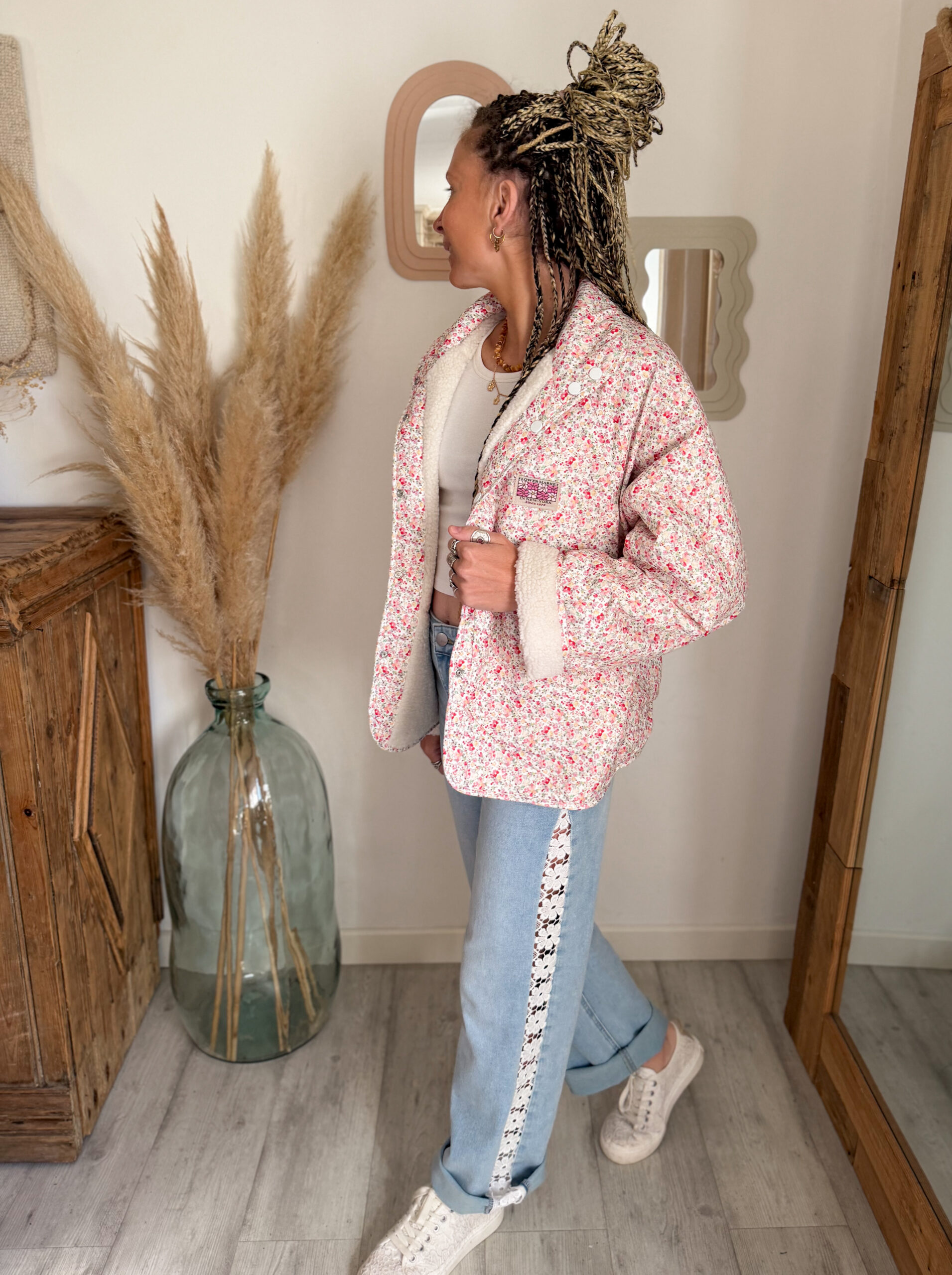 Côté style, le jean NAËM s’accorde parfaitement avec la veste réversible LIA, aussi bien portée côté sherpa pour un look doux et cocooning, que côté fleuri pour une silhouette plus fraîche et romantique. Il se marie aussi très bien avec les sweat-shirts ELIO jaune ou crème, pour des tenues lumineuses, confortables et faciles à porter.