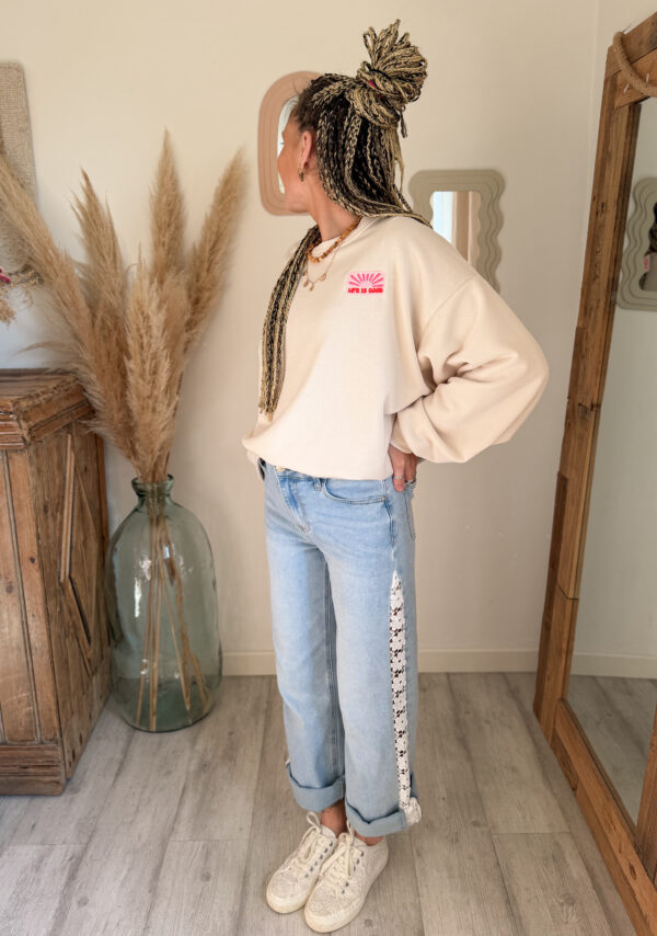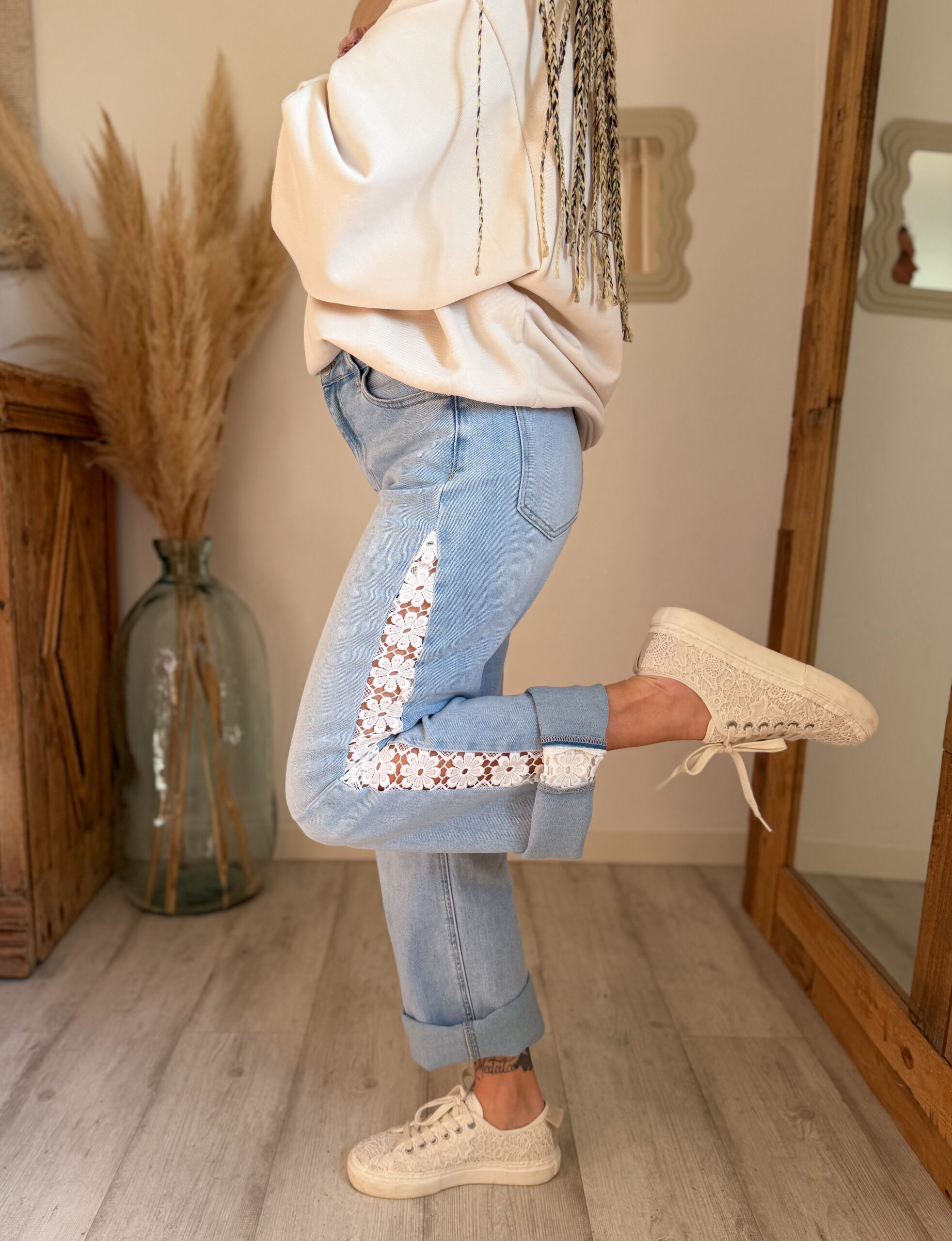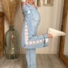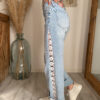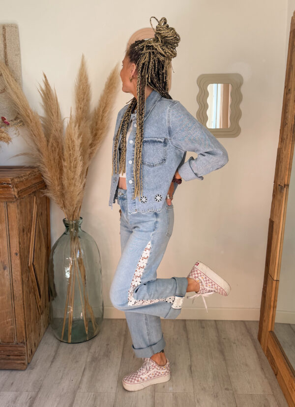 Le détail qui change tout, c’est bien sûr sa dentelle florale sur le côté, qui apporte une note délicate, lumineuse et originale au jean. Ce détail donne immédiatement plus de caractère à la tenue tout en restant facile à associer. On aime ce mélange entre denim casual et finition plus travaillée, qui rend le modèle unique et féminin.