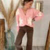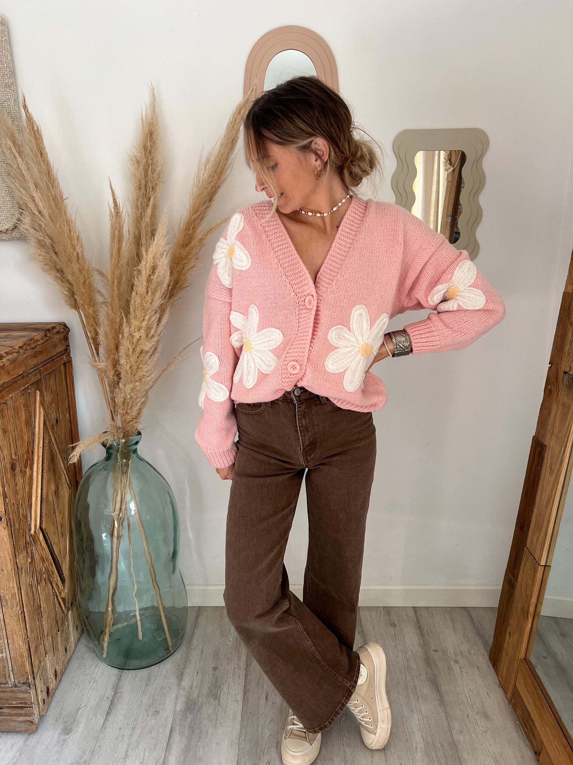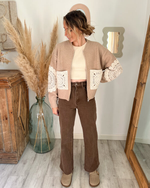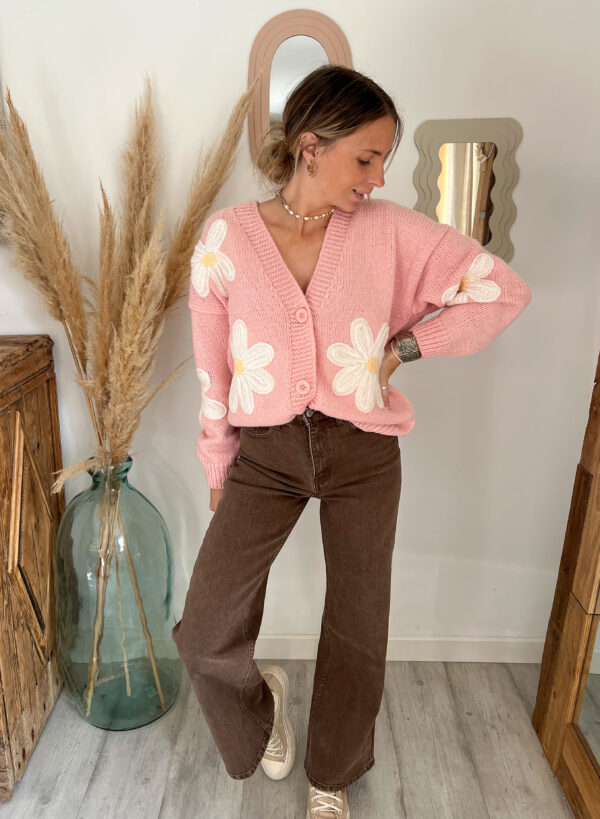 – Enfin, le cardigan Azia apporte une touche de couleur et de caractère tout en restant harmonieux avec la teinte du jean marron.
