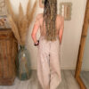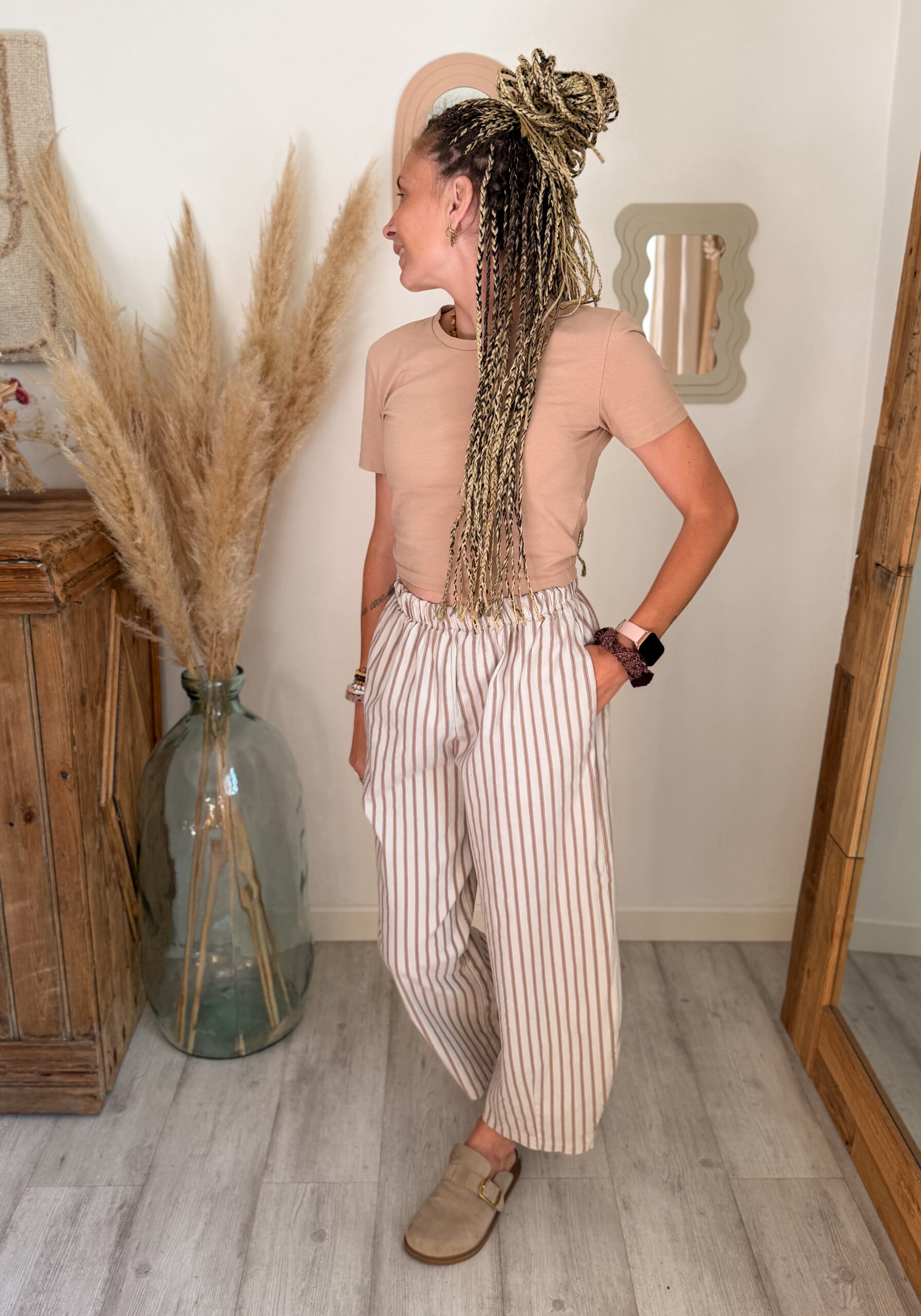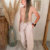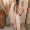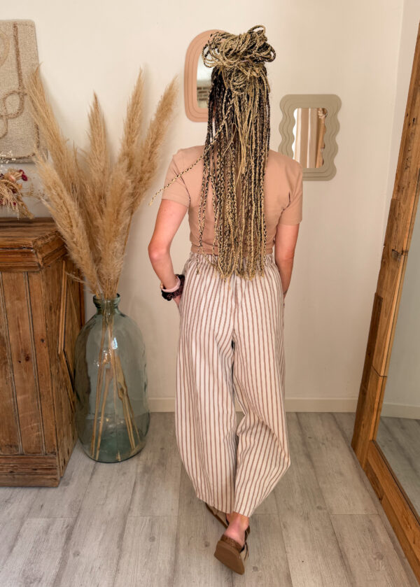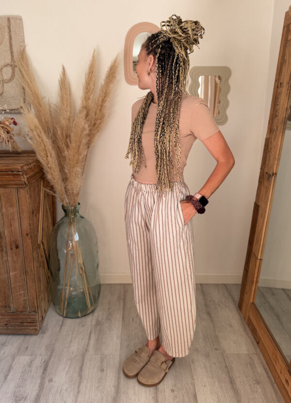 Les rayures verticales apportent une touche graphique tout en allongeant visuellement la silhouette. Les couleurs restent douces et naturelles, ce qui rend ce pantalon ballon femme rayé très facile à associer avec les pièces du dressing.