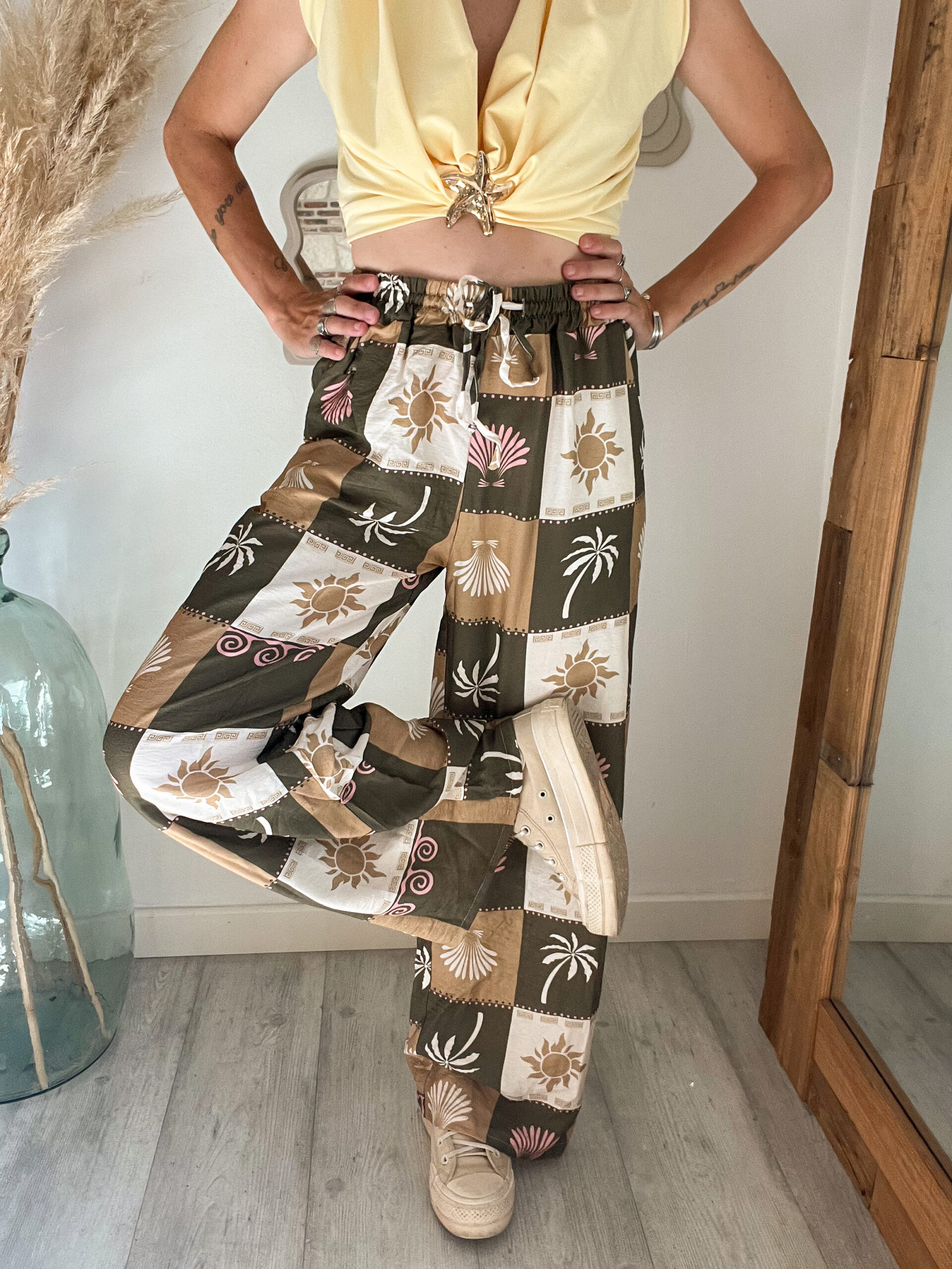 Son imprimé bohème mêle des motifs solaires et végétaux aux teintes chaudes, ponctuées de touches plus douces, qui apportent à la fois originalité et élégance. Inspiré par l’esprit nomade et la douceur estivale, le pantalon Elia devient une pièce maîtresse de la garde-robe féminine.