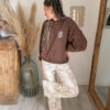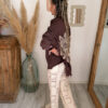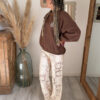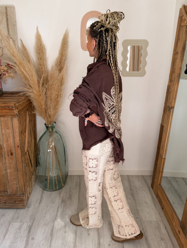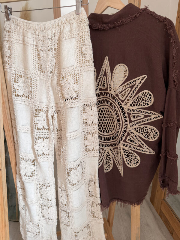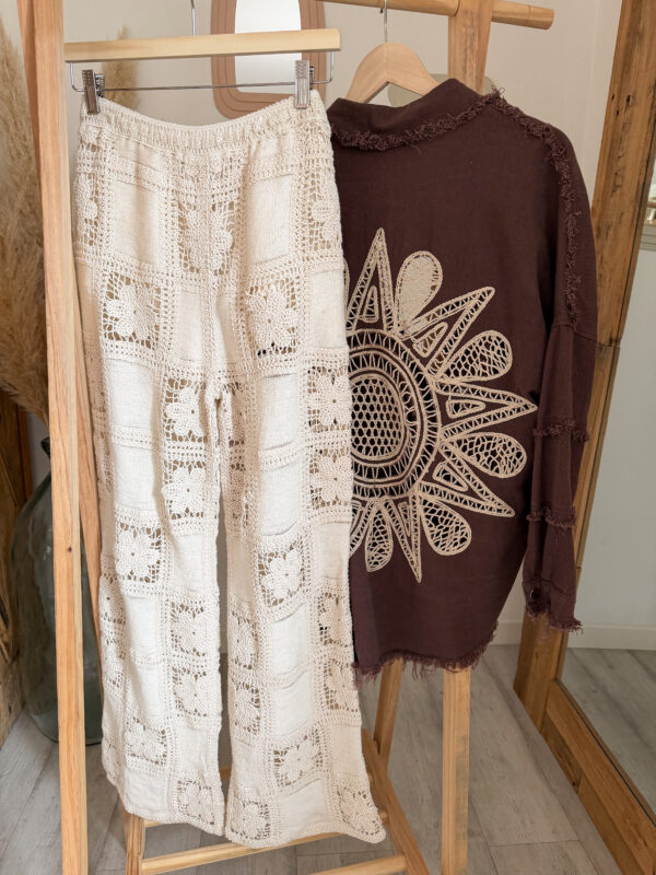 Côté style, le pantalon ALIAH est une vraie pépite polyvalente. Il se mixe facilement pour créer une multitude de looks selon vos envies. Portez-le avec le tee-shirt NEYO gris pour une tenue casual et effortless. Associez-le à la veste en jean AELIA pour une touche moderne et structurée. Pour une allure cocooning, optez pour le sweat JOY marron qui contraste parfaitement avec la légèreté du crochet.