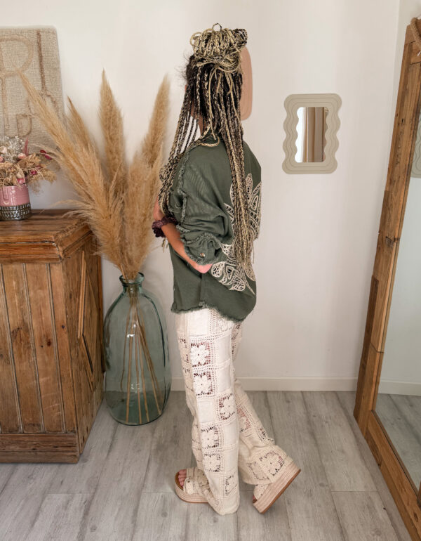 Craquez pour le pantalon ALIAH, une pièce incontournable au style naturel et bohème. Ce pantalon crochet bohème femme séduit immédiatement par son allure délicate et son esprit artisanal, parfait pour une silhouette à la fois élégante et décontractée. Sa teinte écrue lumineuse apporte douceur et authenticité à vos looks, tout en restant facile à associer au quotidien.