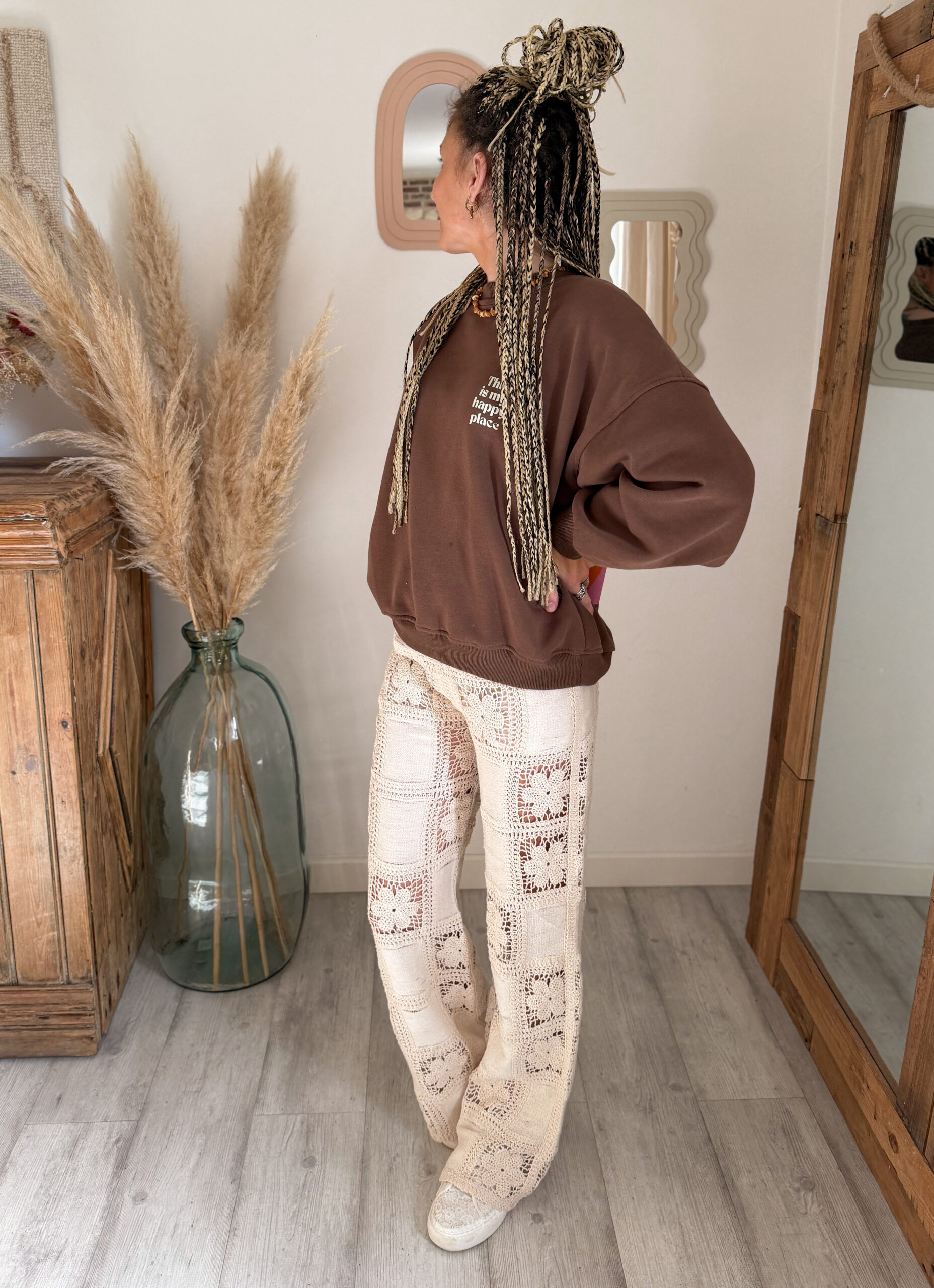 Côté style, le pantalon ALIAH est une vraie pépite polyvalente. Il se mixe facilement pour créer une multitude de looks selon vos envies. Portez-le avec le tee-shirt NEYO gris pour une tenue casual et effortless. Associez-le à la veste en jean AELIA pour une touche moderne et structurée. Pour une allure cocooning, optez pour le sweat JOY marron qui contraste parfaitement avec la légèreté du crochet.
