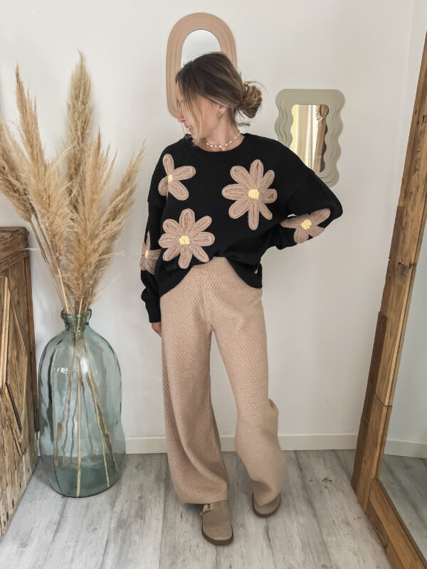Sa taille élastique s’adapte facilement du 36 au 42, tout en garantissant une silhouette harmonieuse et un tombé élégant. Le modèle mesure 1m63 et porte habituellement du 34, mais le pantalon taille légèrement grand, d’où sa recommandation à partir du 36. Sa matière tricotée en relief apporte un vrai jeu de texture qui sublime n’importe quelle pièce.