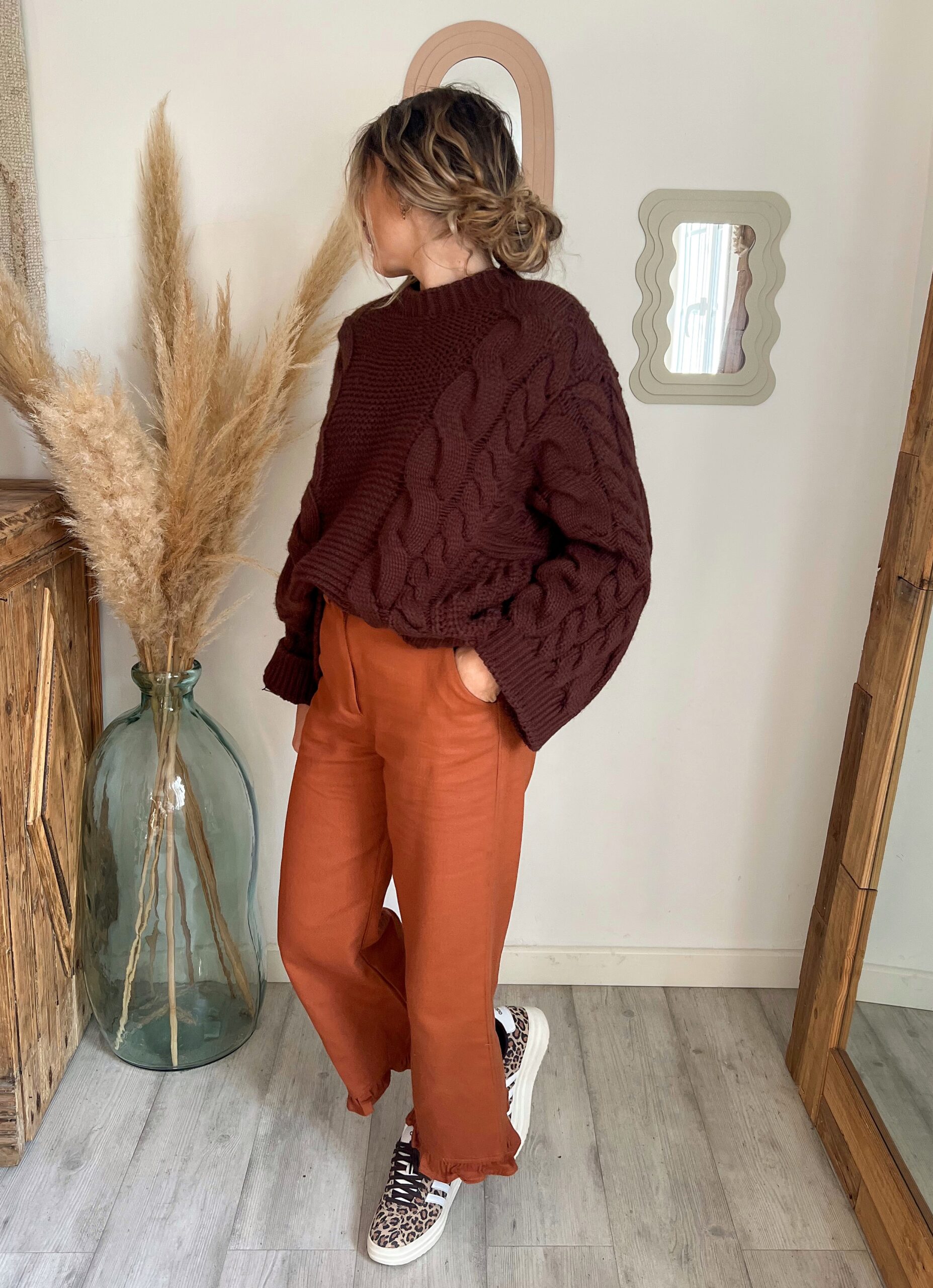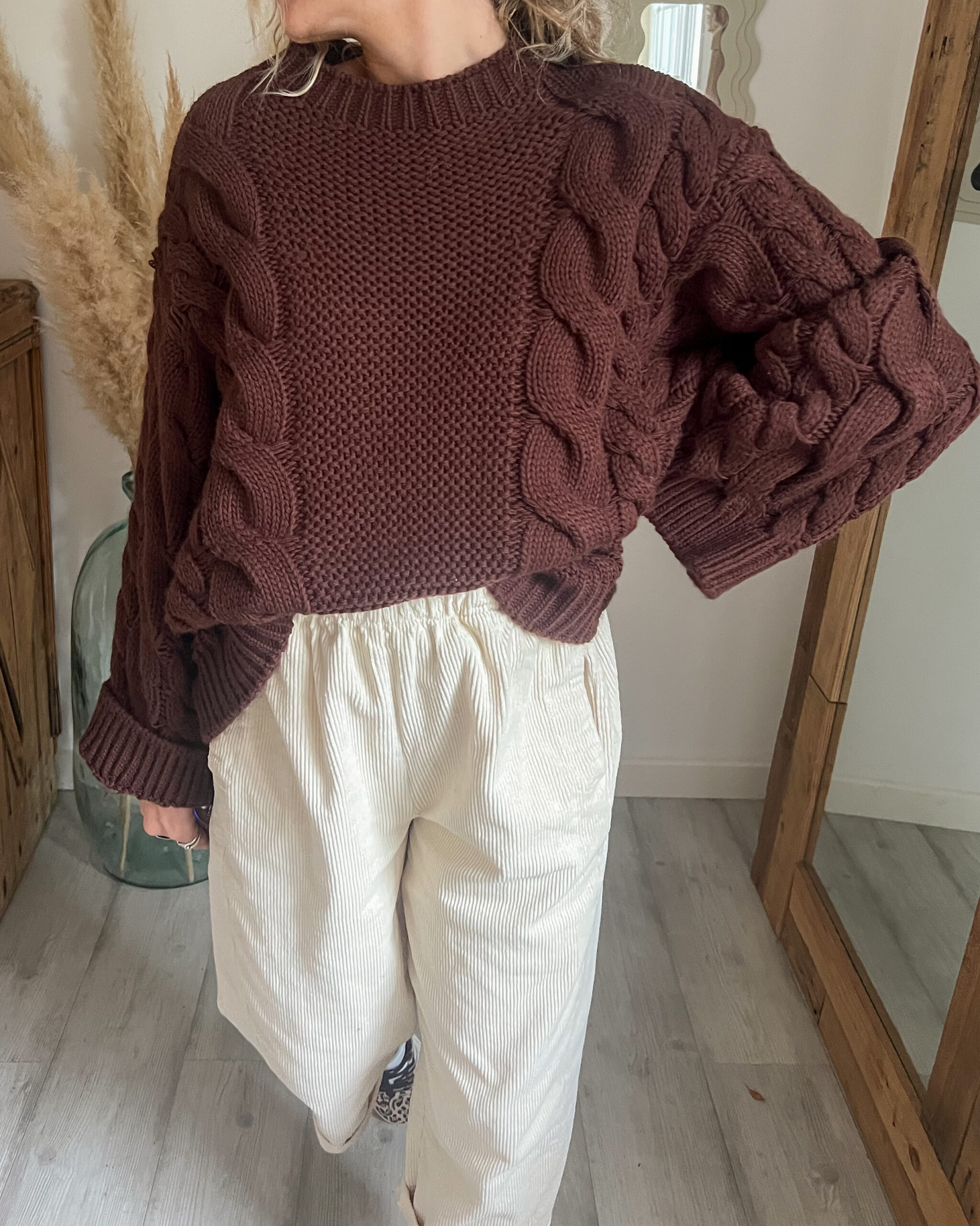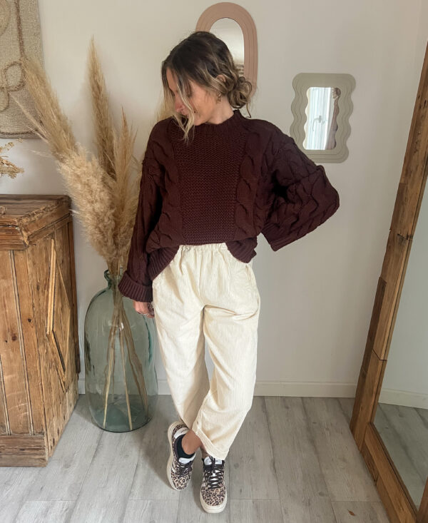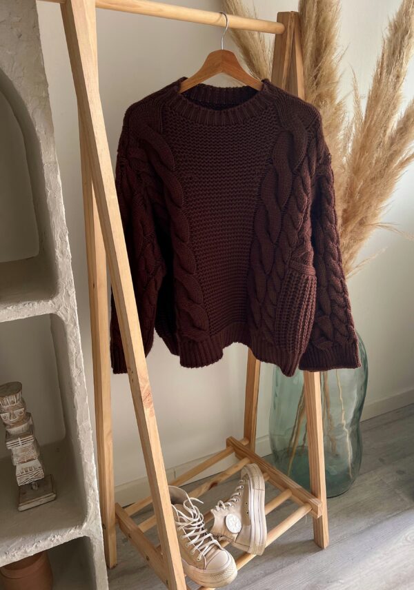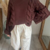 Sa coupe loose apporte cette allure décontractée mais toujours soignée — l’équilibre parfait entre confort et style. Le pull torsadé chocolat femme s’adapte facilement à tous les looks, qu’on le porte rentré dans un pantalon taille haute ou simplement posé sur un jean.