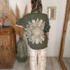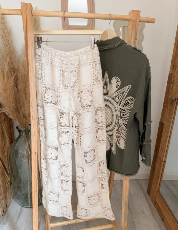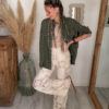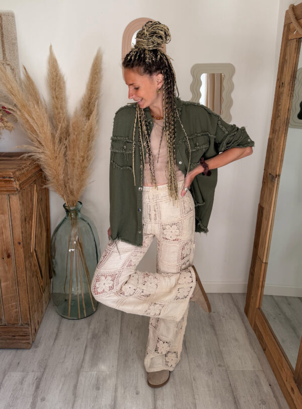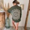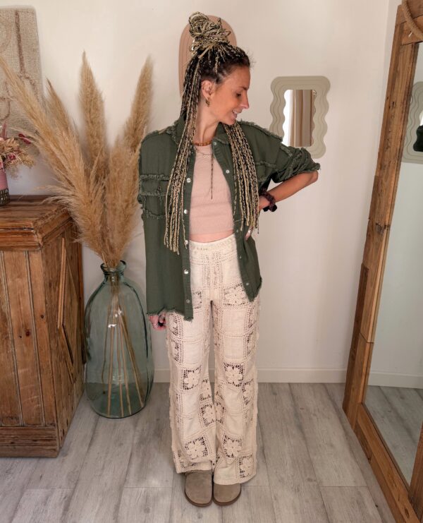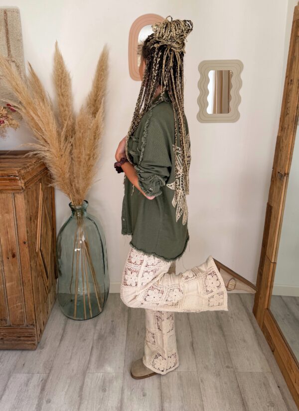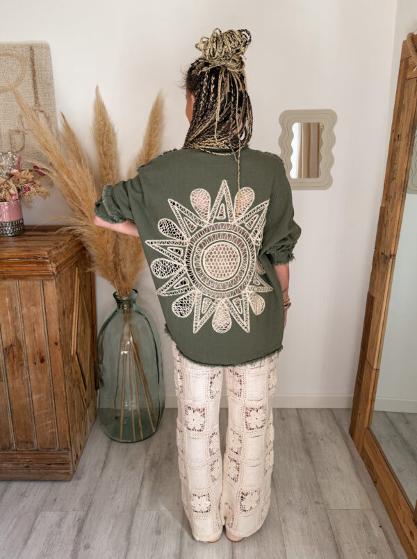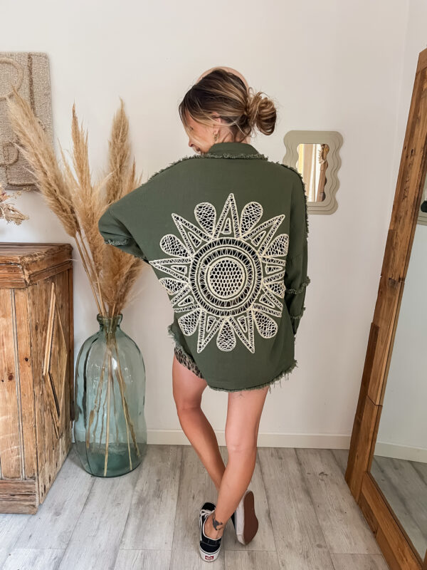 Conçue pour celles qui aiment les pièces fortes, cette surchemise bohème femme kaki se distingue par son incroyable détail au dos : une broderie soleil en crochet, travaillée avec finesse, qui apporte une vraie signature bohème et artisanale. Ce motif unique attire immédiatement le regard et donne du caractère à n’importe quelle tenue.