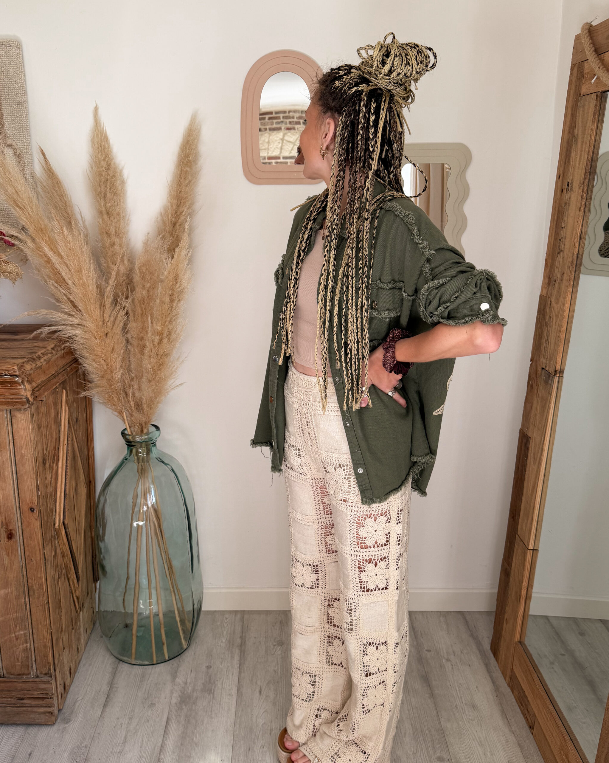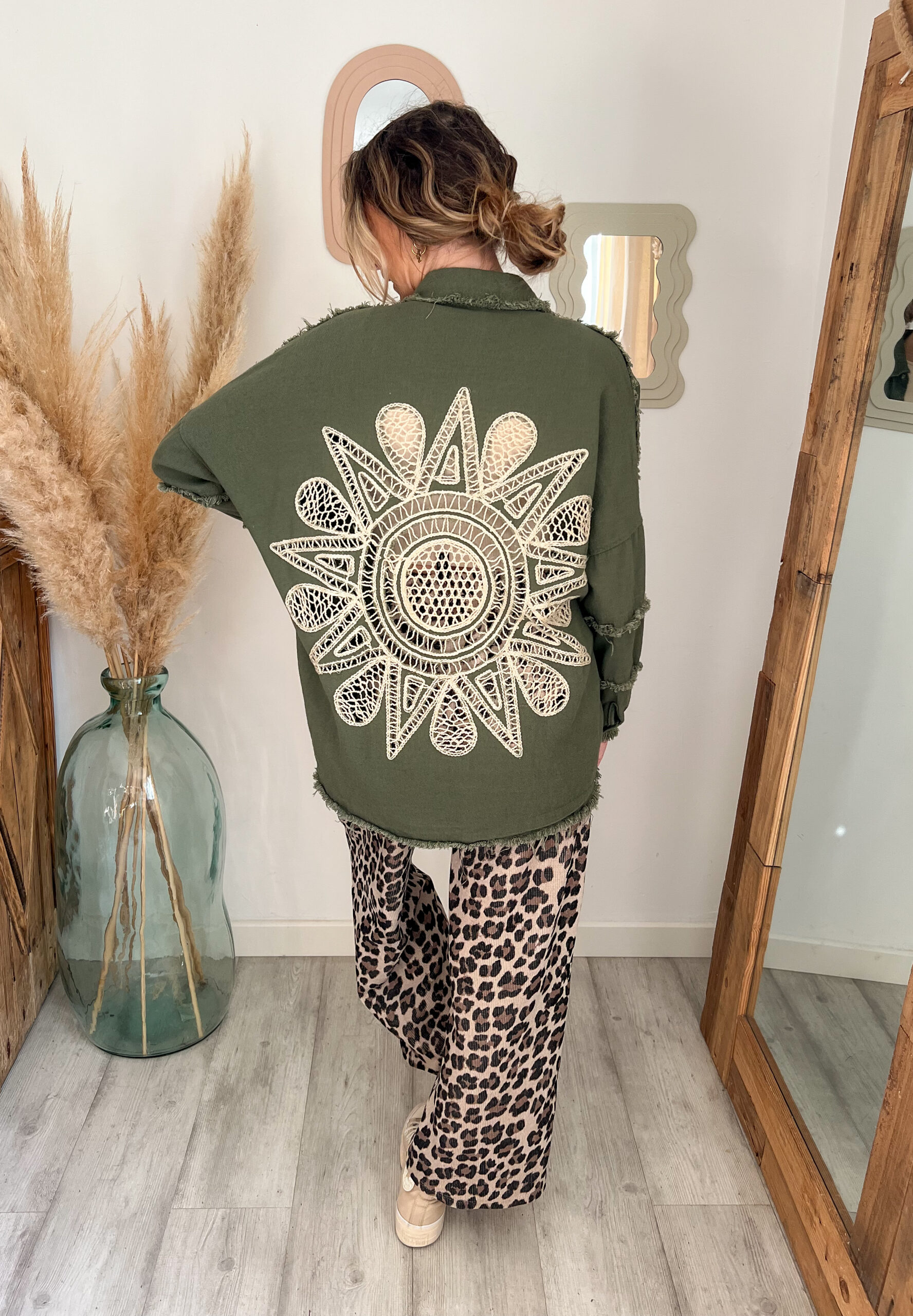 Conçue pour celles qui aiment les pièces fortes, cette surchemise bohème femme kaki se distingue par son incroyable détail au dos : une broderie soleil en crochet, travaillée avec finesse, qui apporte une vraie signature bohème et artisanale. Ce motif unique attire immédiatement le regard et donne du caractère à n’importe quelle tenue.