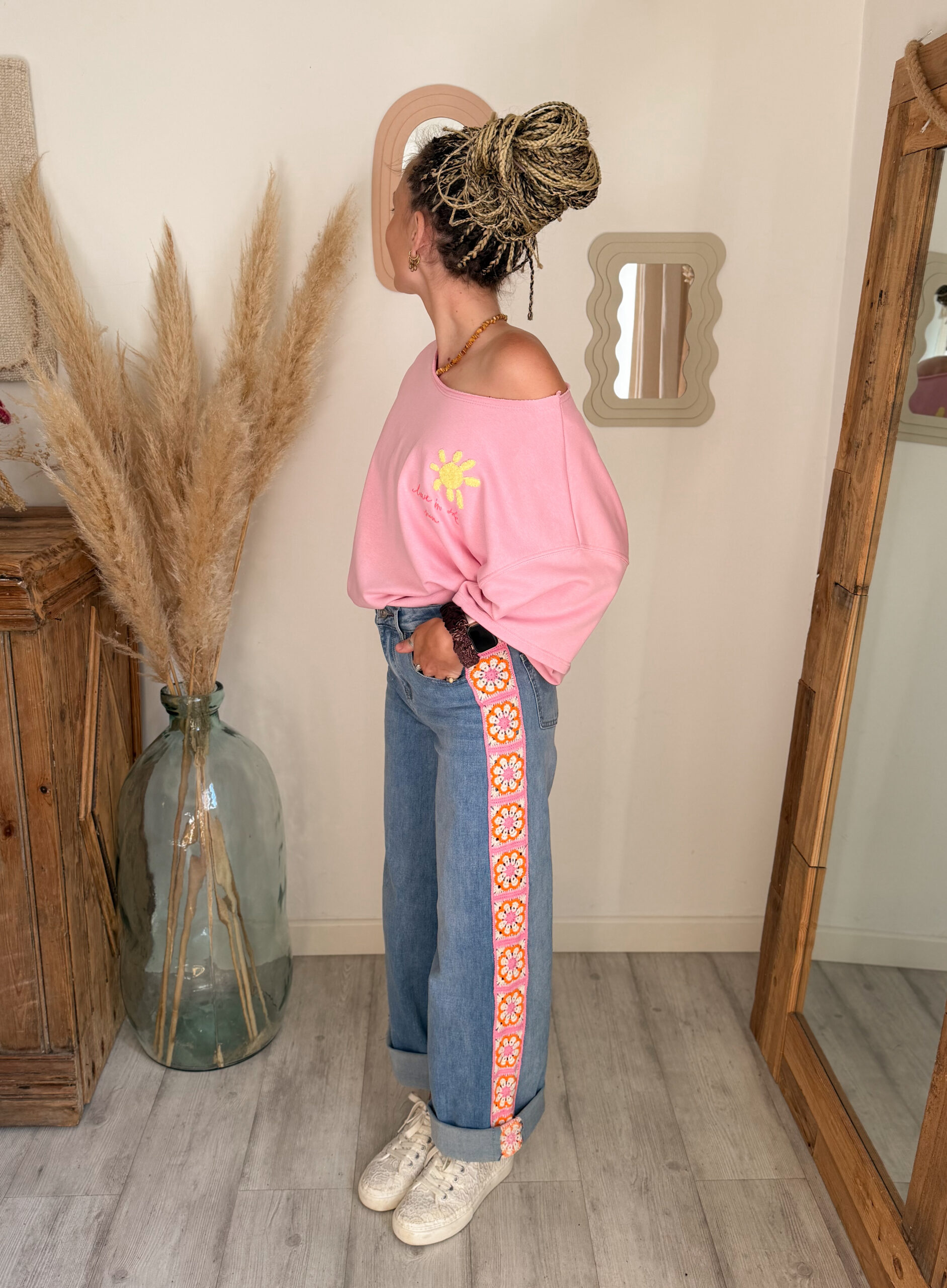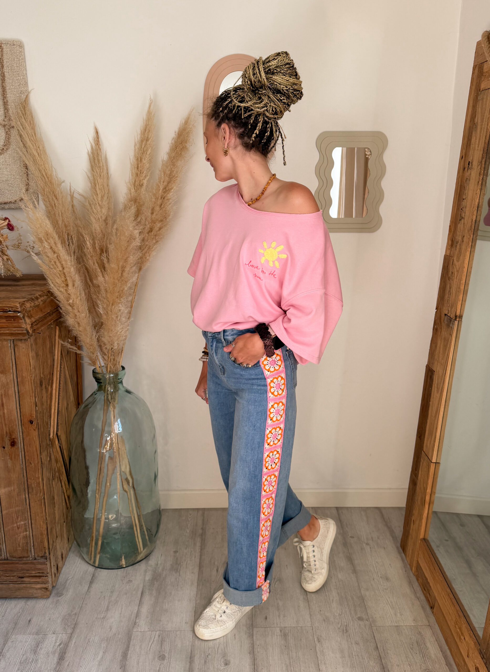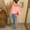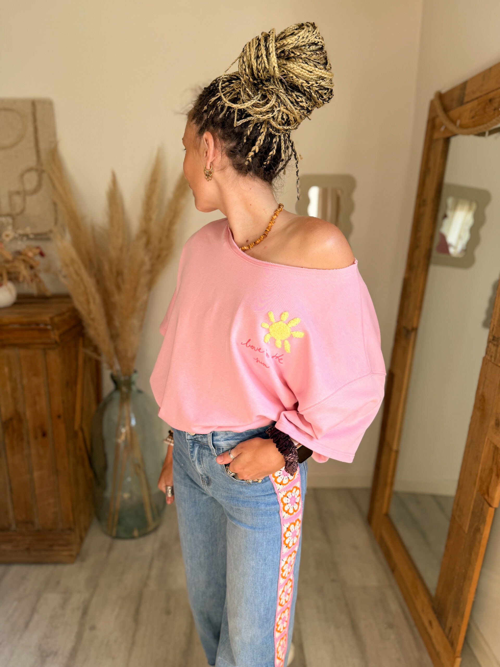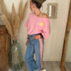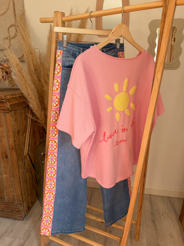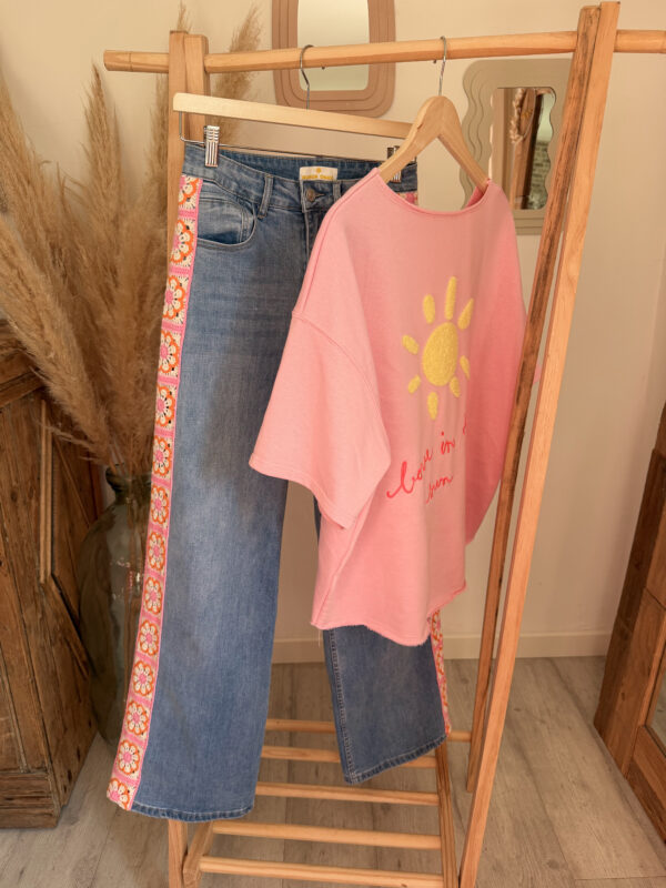 Côté style, ce sweat est très facile à associer. Il se marie parfaitement avec un jean, un short ou encore un pantalon fluide pour créer un look casual et tendance. Pour une tenue complète et harmonieuse, il s’accorde particulièrement bien avec le jean Sunrise, avec lequel il crée un ensemble lumineux et moderne.