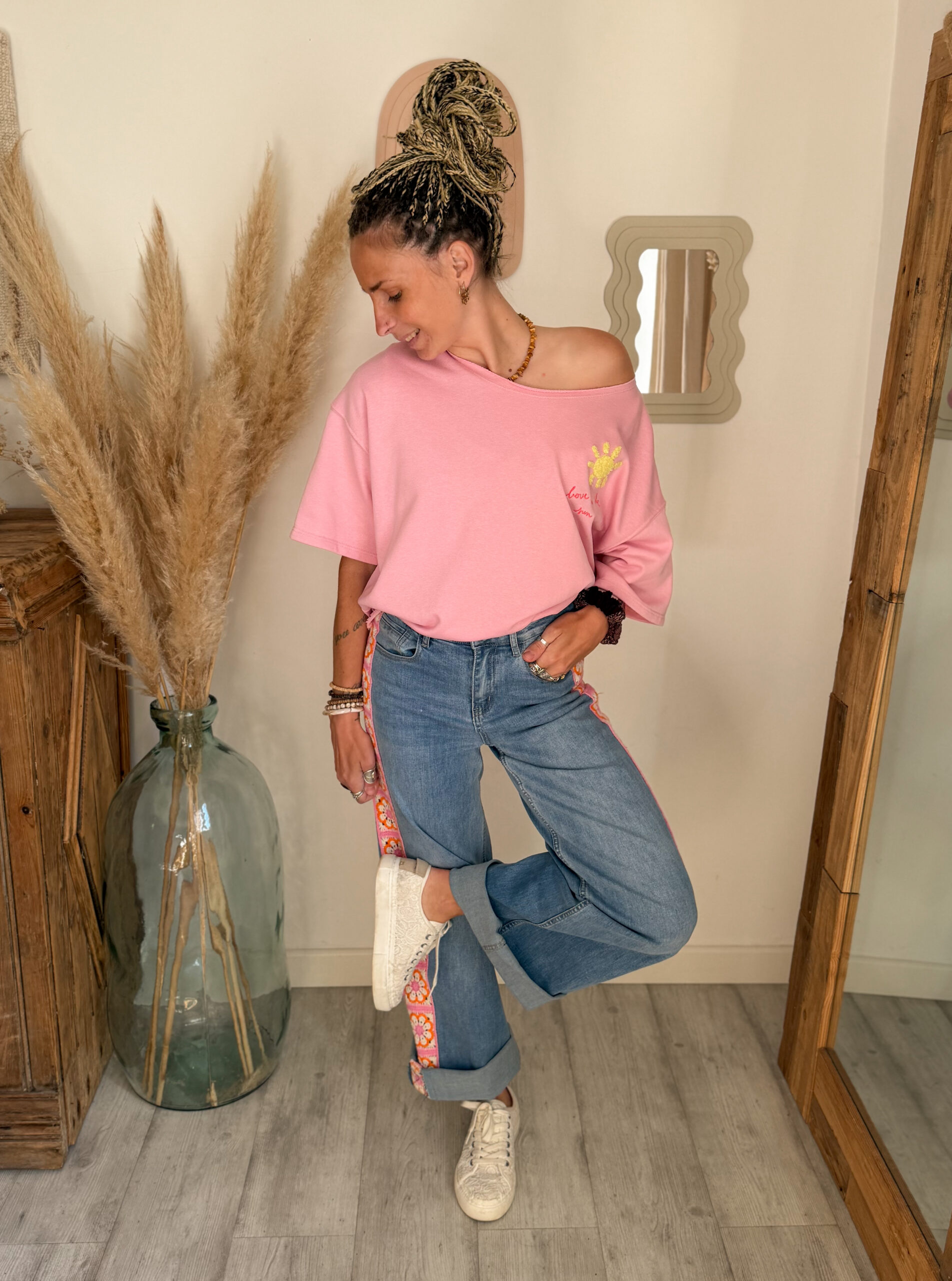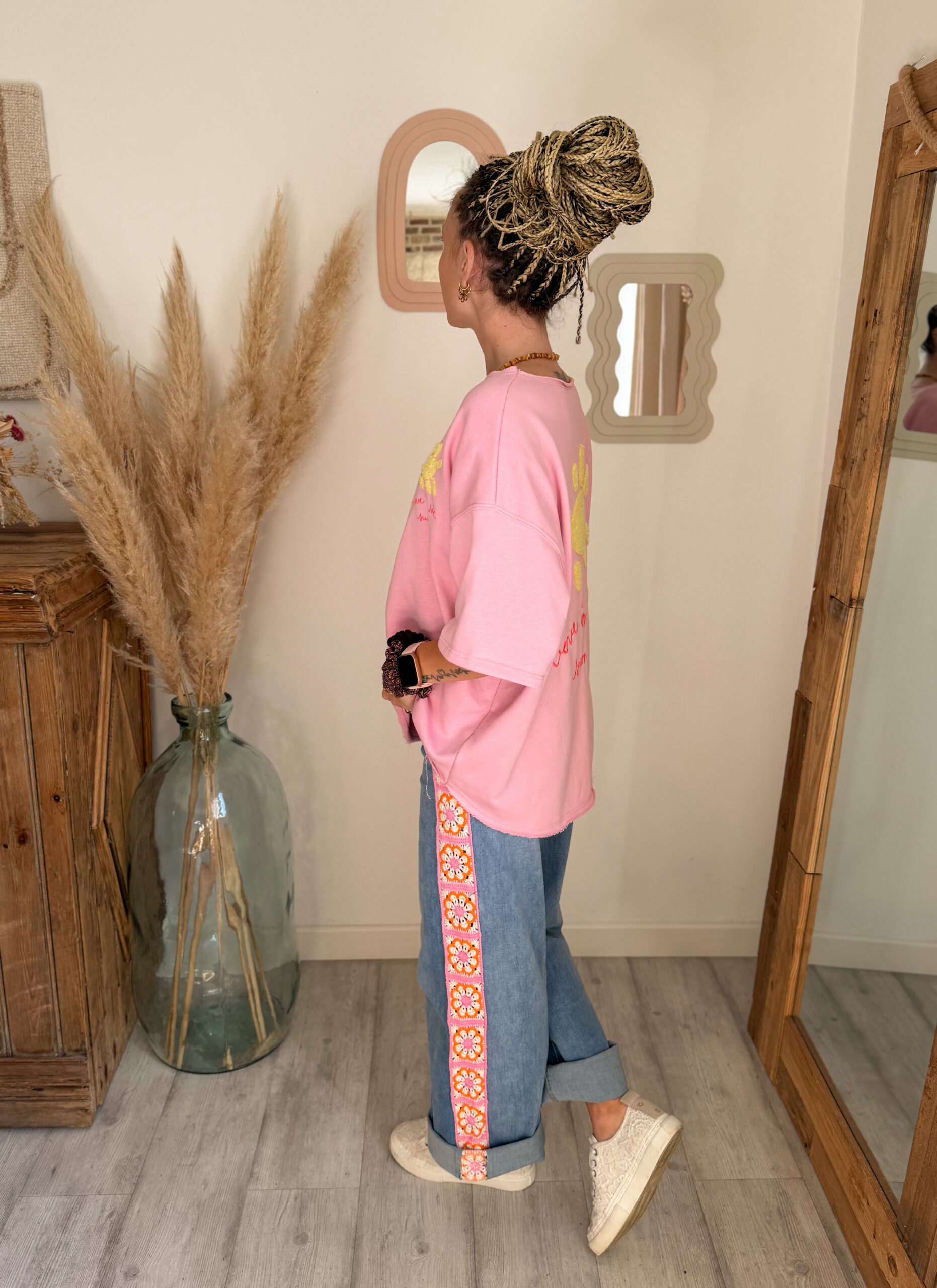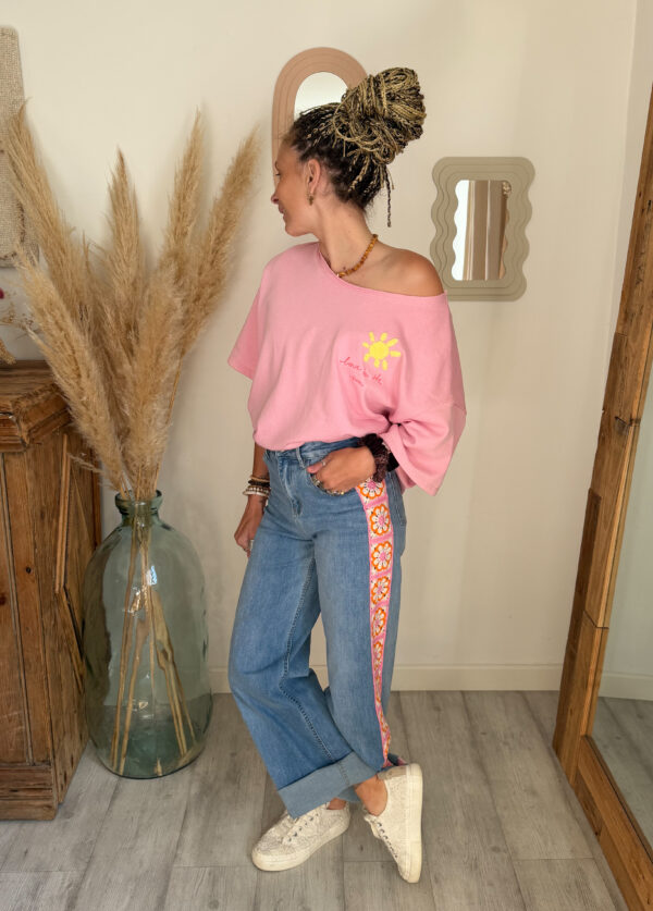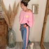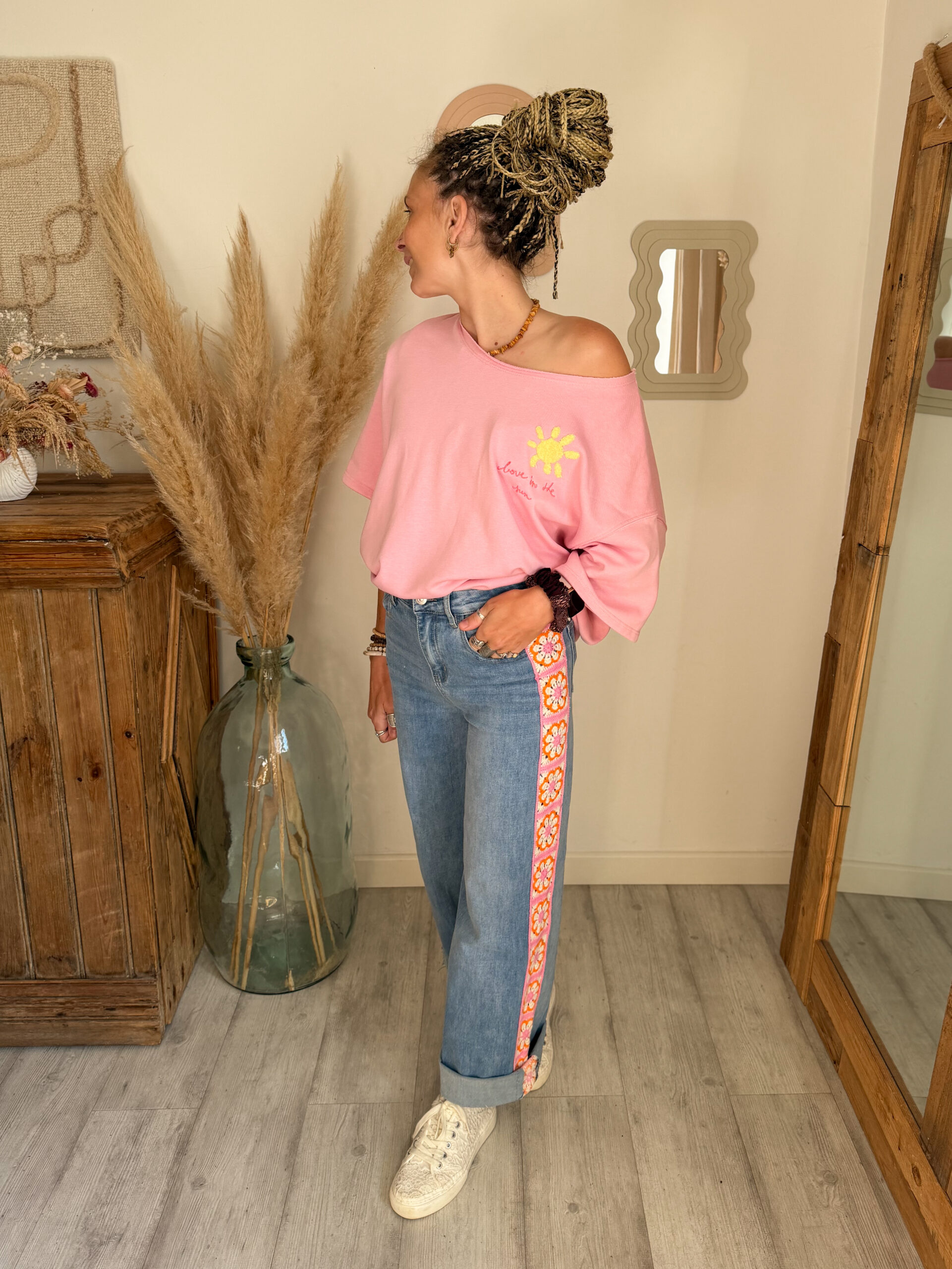 Côté style, ce sweat est très facile à associer. Il se marie parfaitement avec un jean, un short ou encore un pantalon fluide pour créer un look casual et tendance. Pour une tenue complète et harmonieuse, il s’accorde particulièrement bien avec le jean Sunrise, avec lequel il crée un ensemble lumineux et moderne.