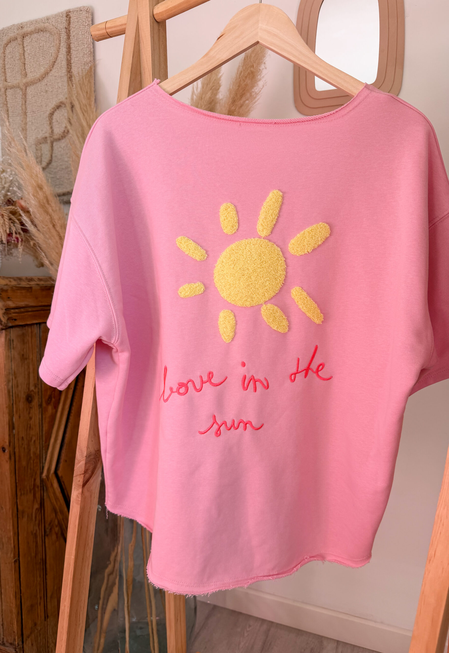 Le sweat-shirt femme soleil Solea est une pièce lumineuse et pleine de bonne humeur qui apporte instantanément une touche solaire à votre tenue. Avec sa couleur rose douce et son motif soleil en relief, il incarne parfaitement l’esprit casual et bohème d’un dressing moderne.