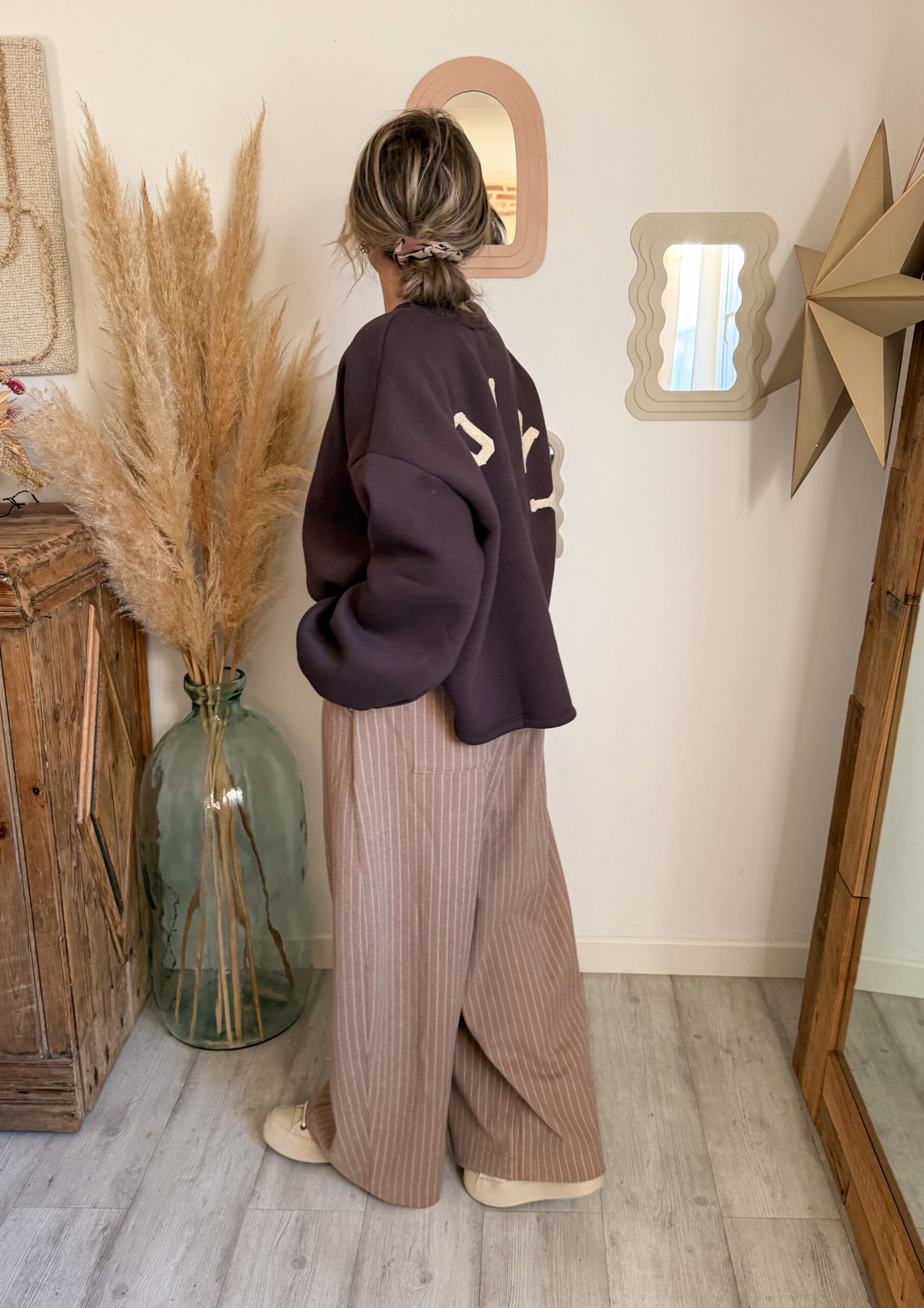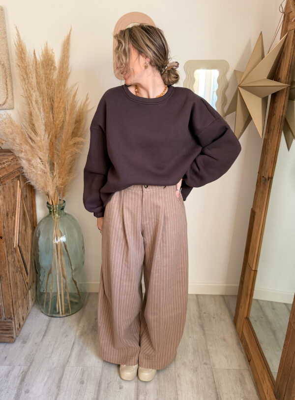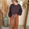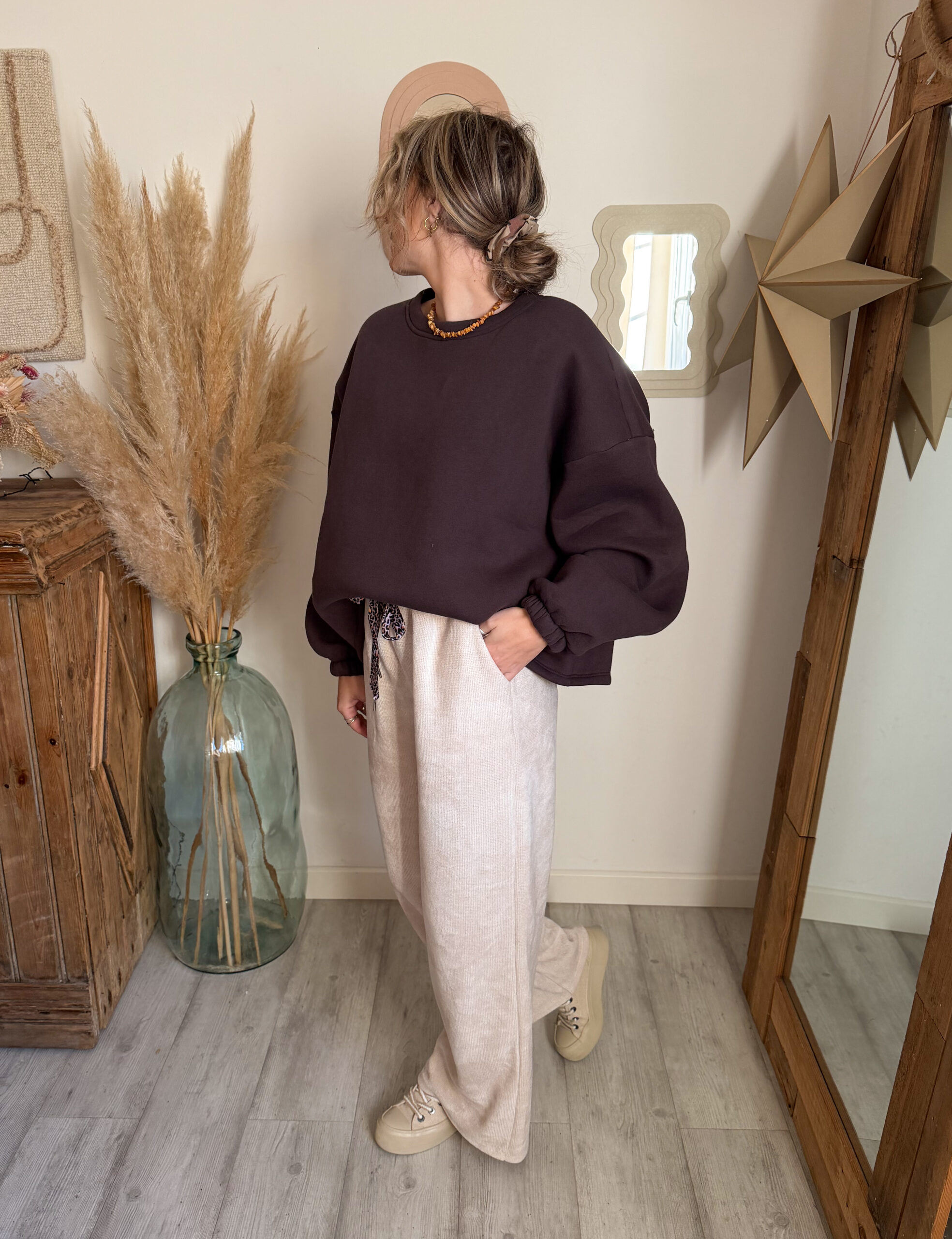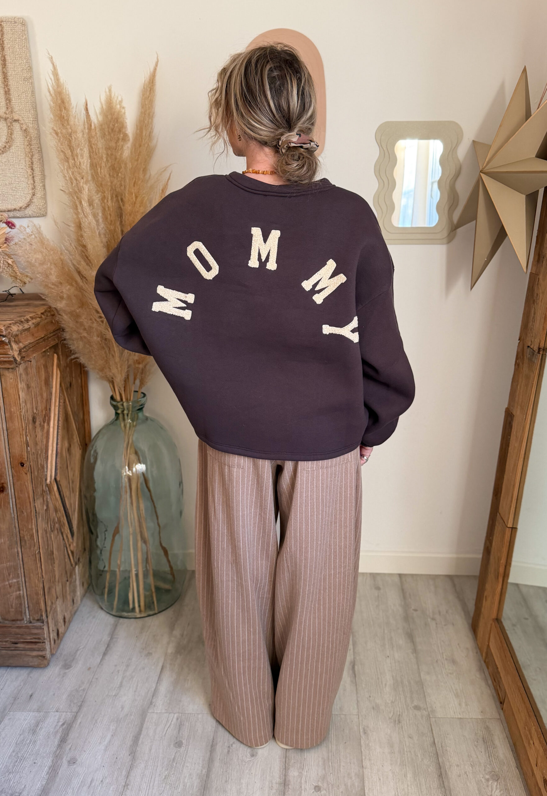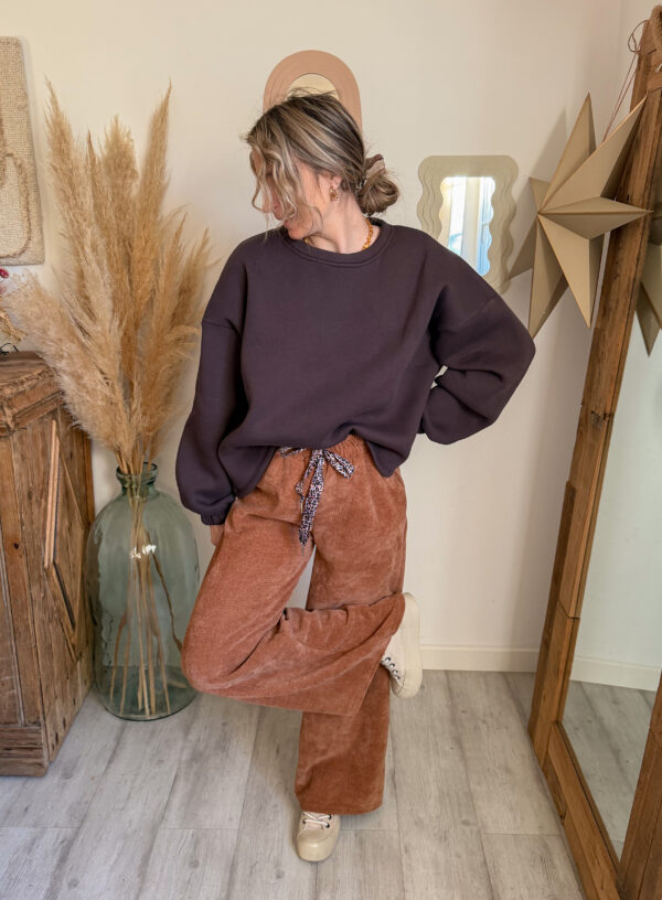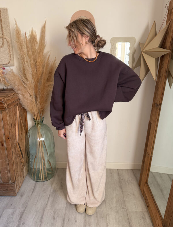 Côté associations, le sweat-shirt Mommy femme est un véritable caméléon. Il se porte aussi bien avec les pantalons SOA en velours côtelé nid d’abeille, disponibles en crème, chocolat et caramel, pour un look cosy et harmonieux. Il s’accorde également parfaitement avec le pantalon large à rayures MILAN, en version beige ou marron, pour une silhouette plus structurée et tendance.