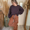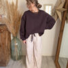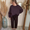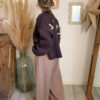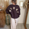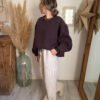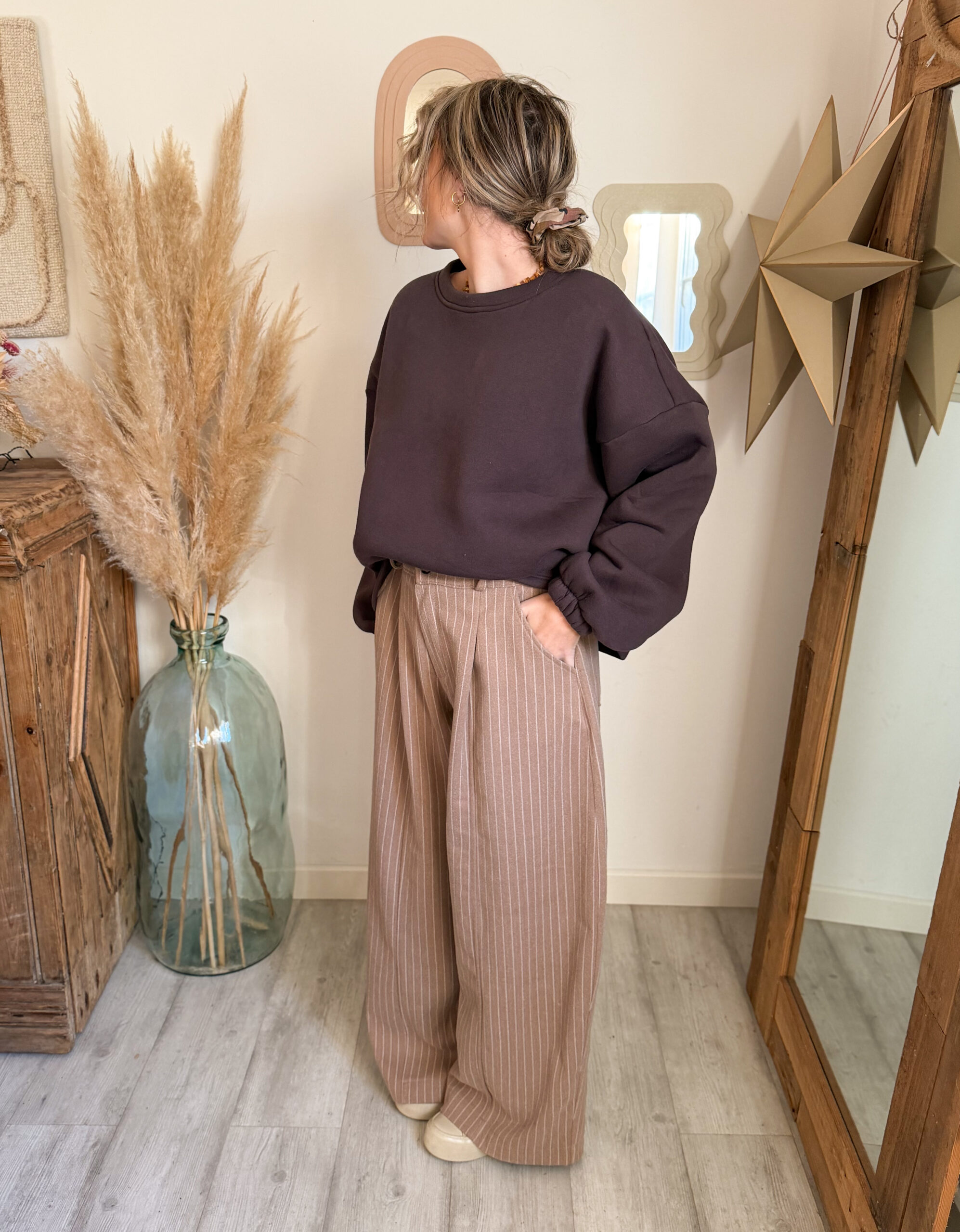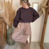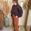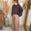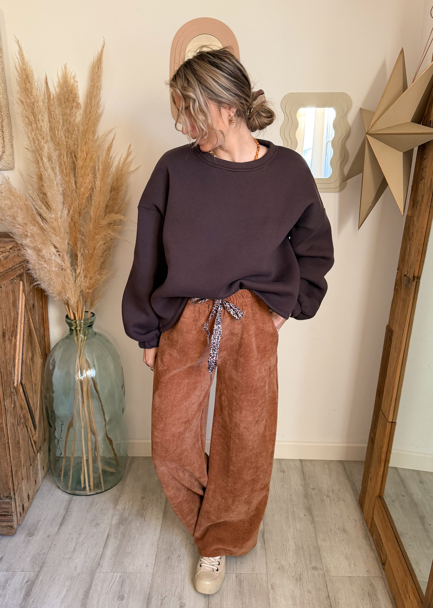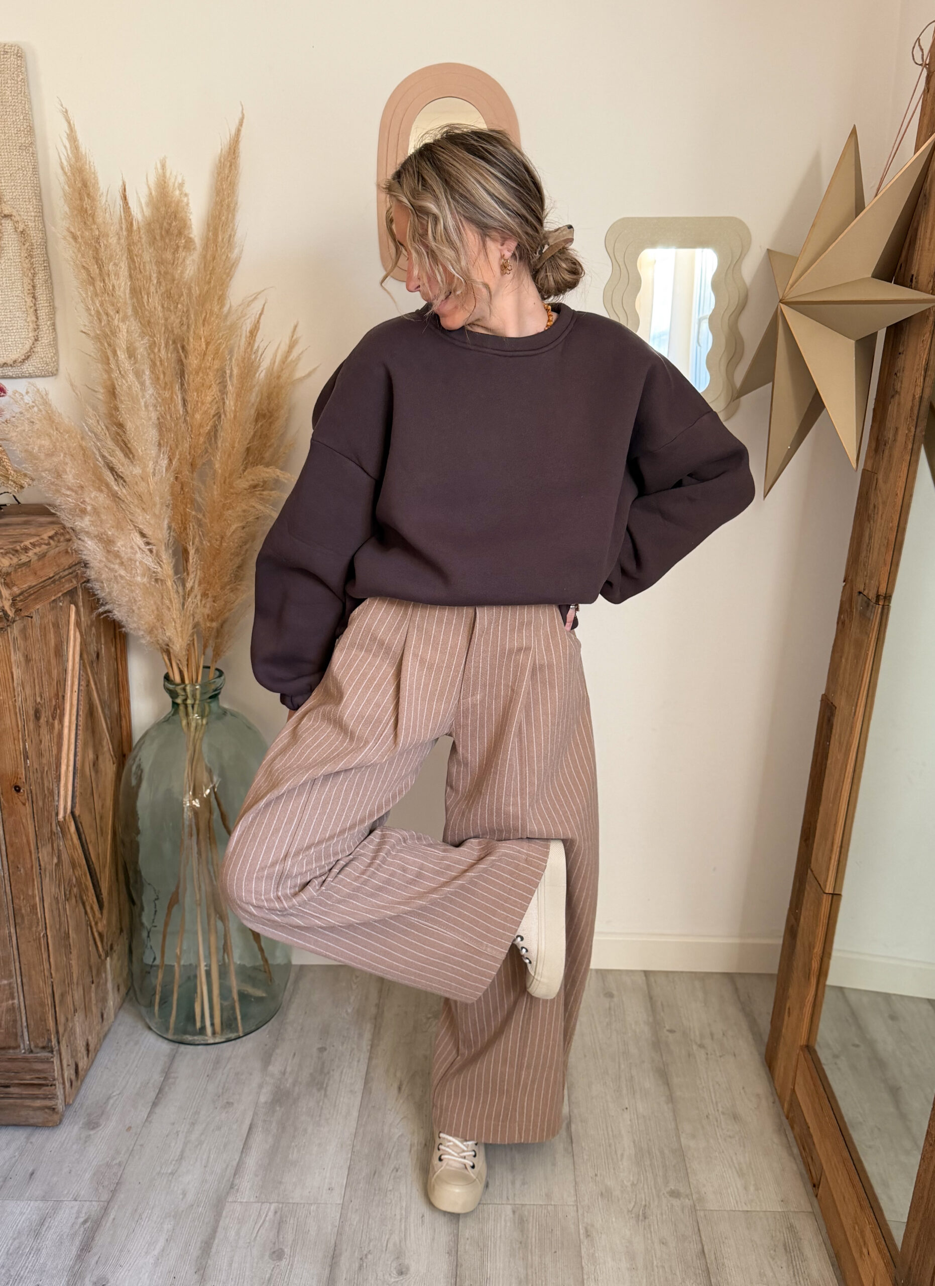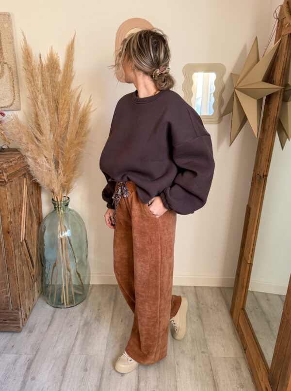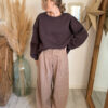 Côté associations, le sweat-shirt Mommy femme est un véritable caméléon. Il se porte aussi bien avec les pantalons SOA en velours côtelé nid d’abeille, disponibles en crème, chocolat et caramel, pour un look cosy et harmonieux. Il s’accorde également parfaitement avec le pantalon large à rayures MILAN, en version beige ou marron, pour une silhouette plus structurée et tendance.