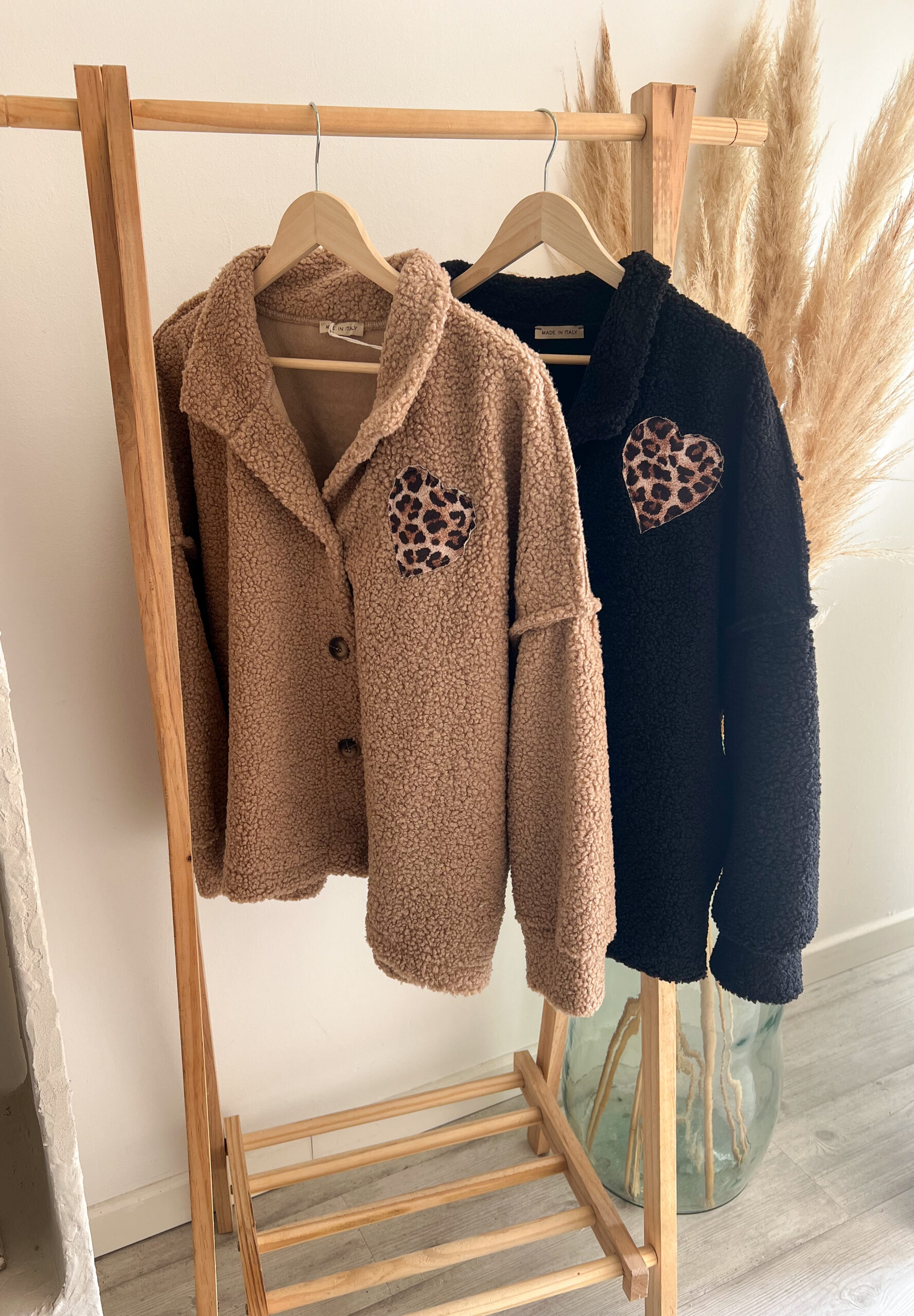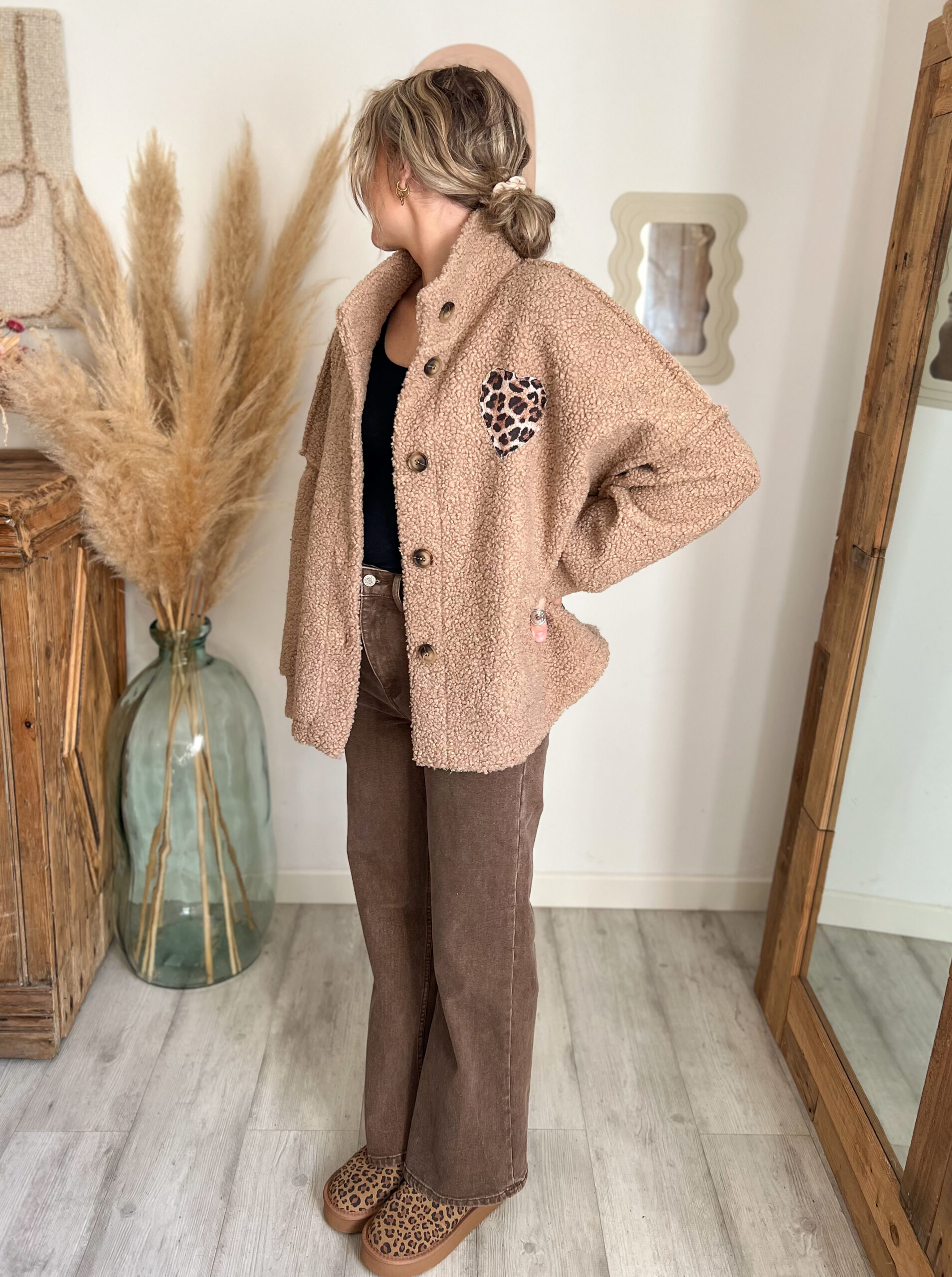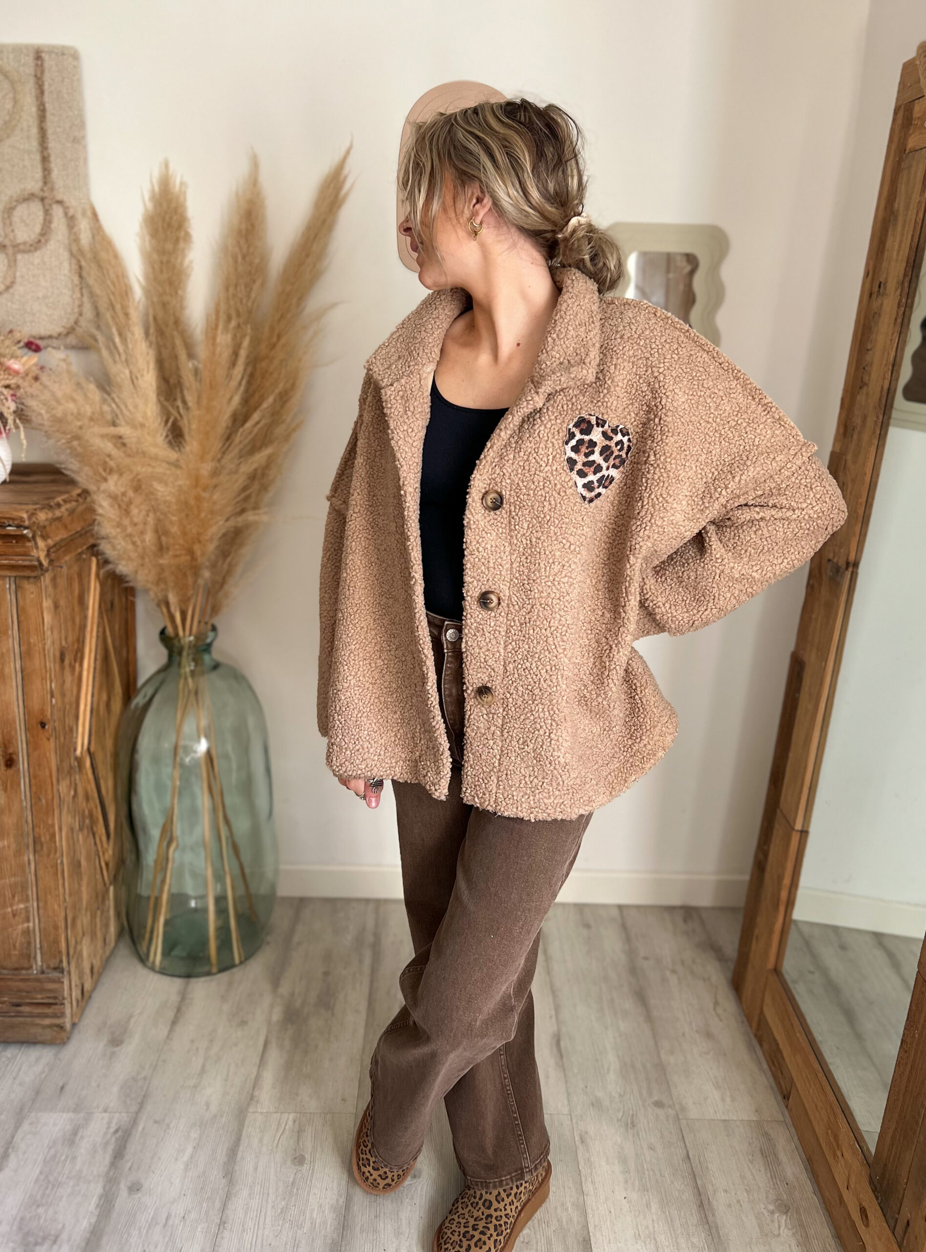 Le détail du cœur léopard est entièrement cousu, ce qui renforce son côté qualitatif et durable. Ce cœur n’est ni trop voyant ni trop discret : juste ce qu’il faut pour attirer l’œil et créer un coup de cœur immédiat. C’est cette alliance entre simplicité et détail fort qui fait d’elle une véritable veste femme cœur léopard, pensée pour durer et pour accompagner toutes tes pièces favorites.