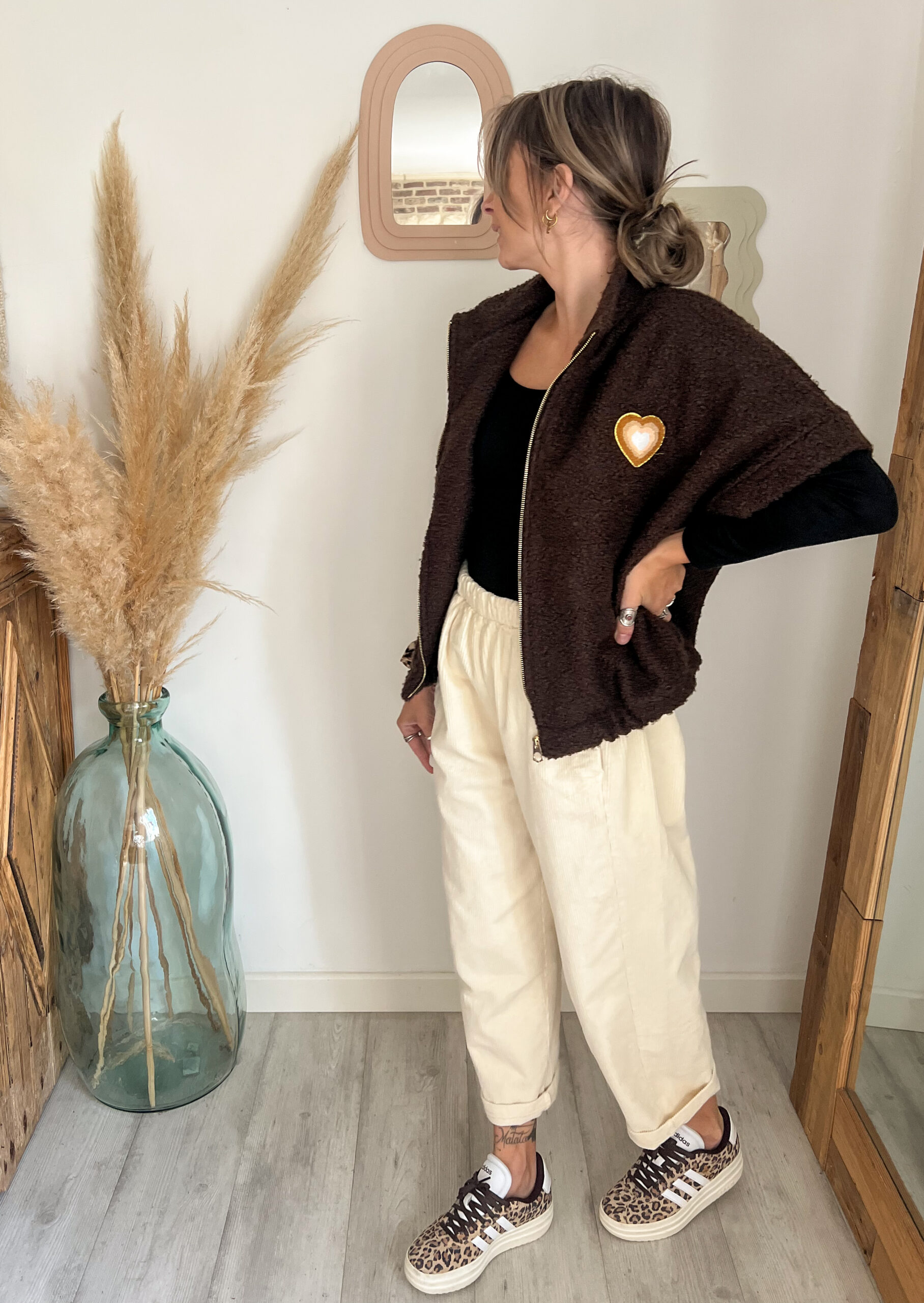 Et pour un rendu plus lumineux et structuré, on adore la porter avec le pantalon NOA en velours côtelé crème — le mélange du velours et de la bouclette crée un jeu de matières subtile et très actuel.