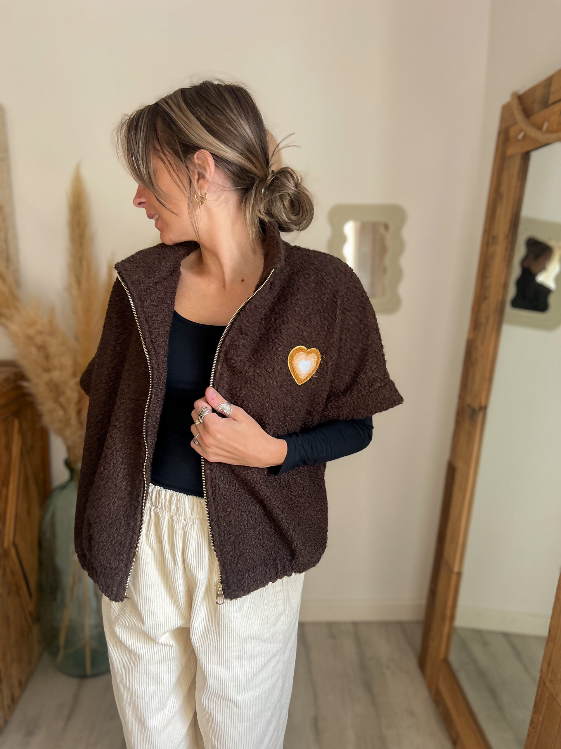 Sa teinte chocolat profonde est un vrai atout. À la fois chaude, naturelle et élégante, elle flatte toutes les carnations et s’accorde avec une multitude de couleurs : beige, crème, terracotta, écru ou imprimé. C’est une veste bouclette chocolat femme qui s’adapte à tous les styles sans effort.