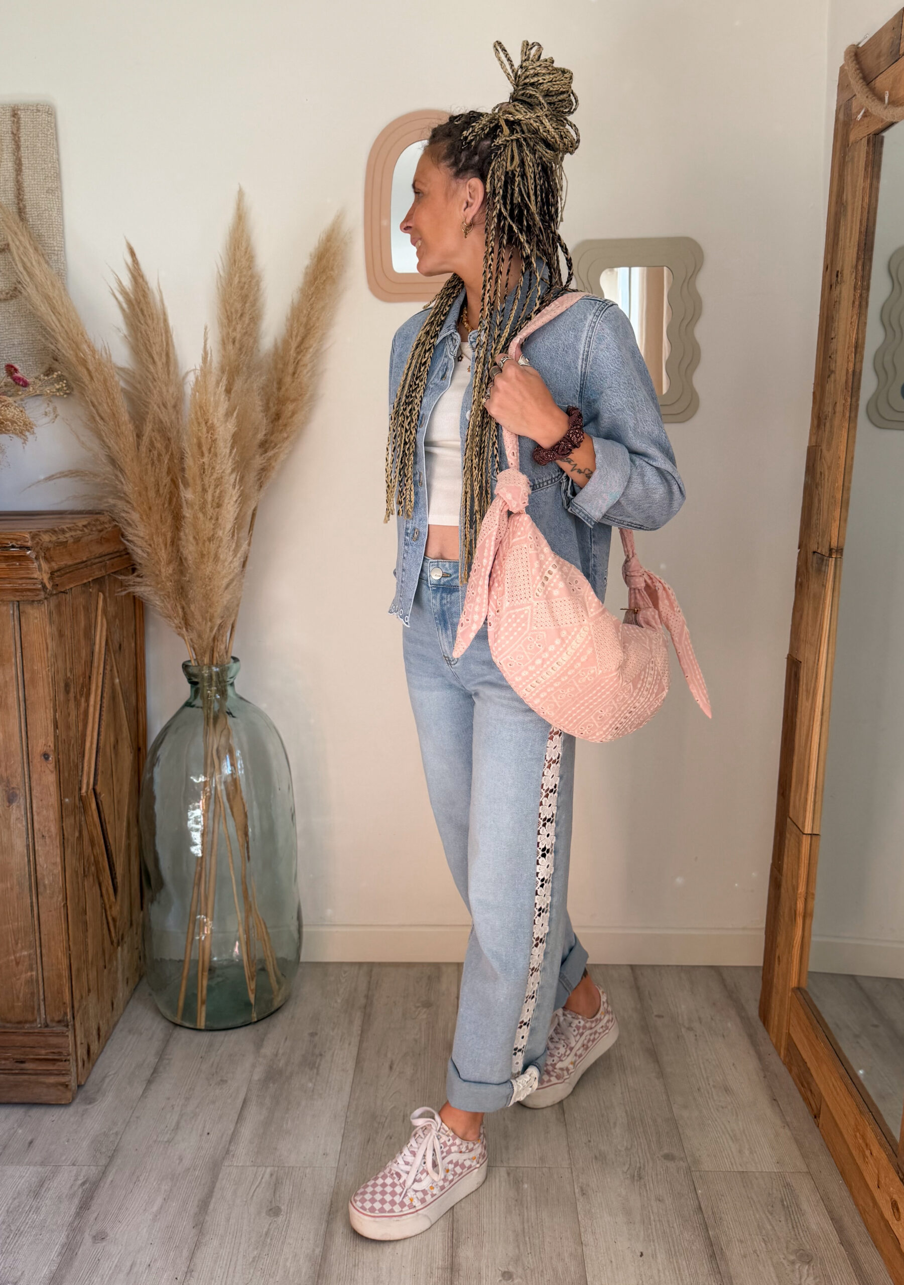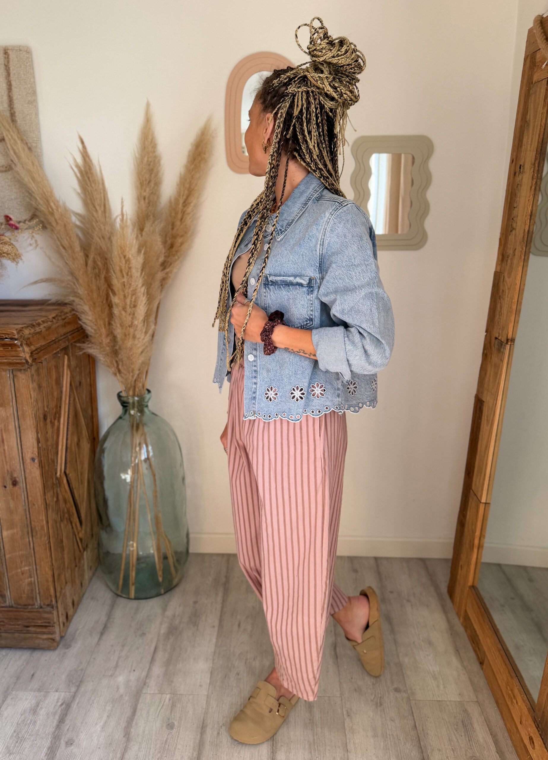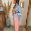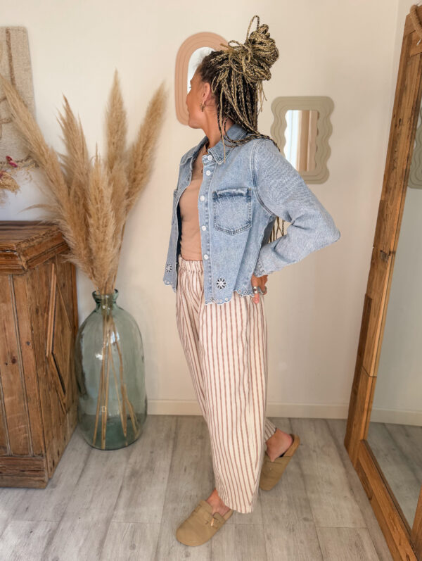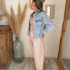 La veste jean femme broderie AELIA est parfaite pour créer des looks variés selon vos envies. Elle s’associe à merveille avec les pantalons Sandro, en version Rose pour une silhouette douce et lumineuse, ou en beige pour un rendu plus naturel et épuré. Elle se marie également parfaitement avec le jean NAEM pour un total look denim très tendance.