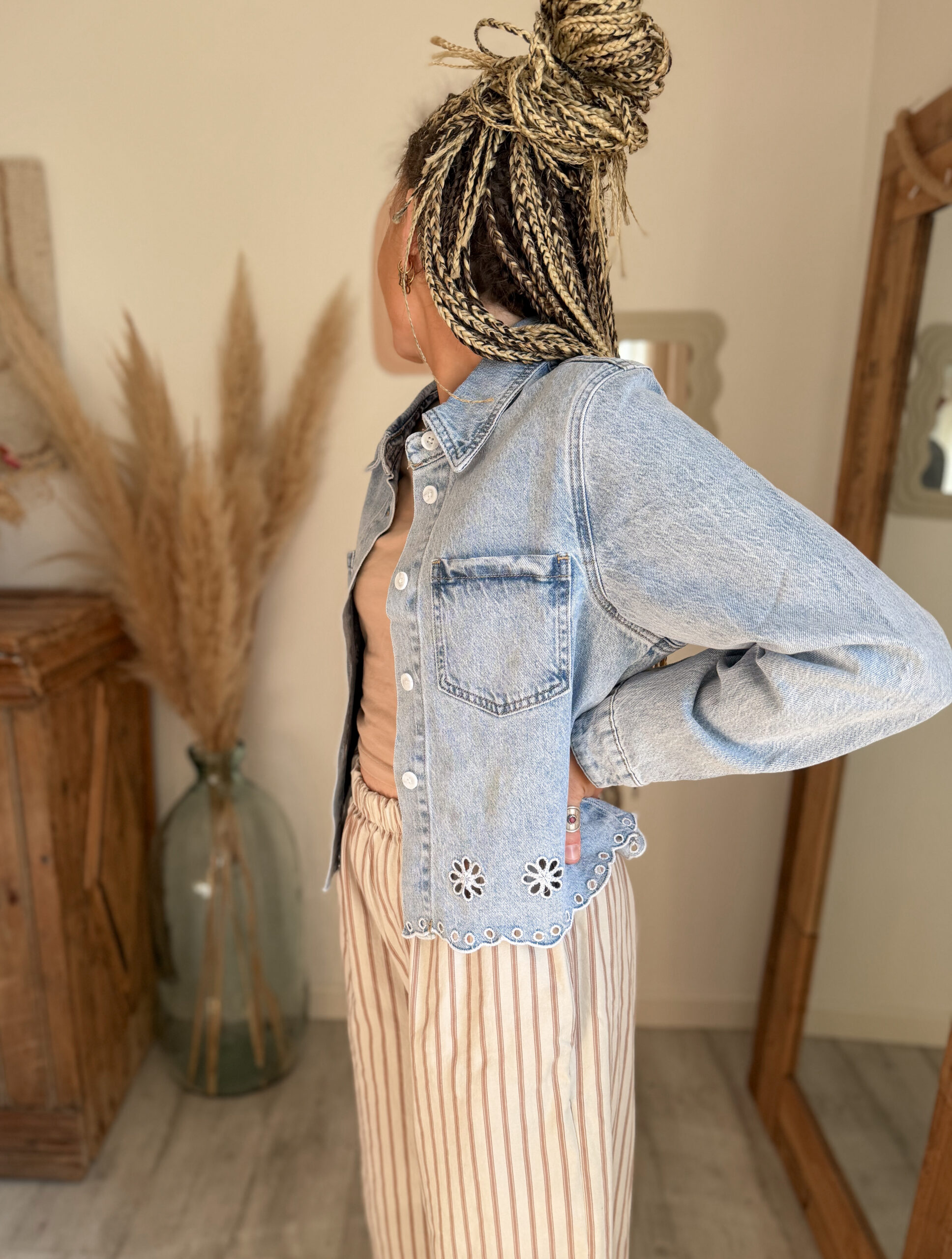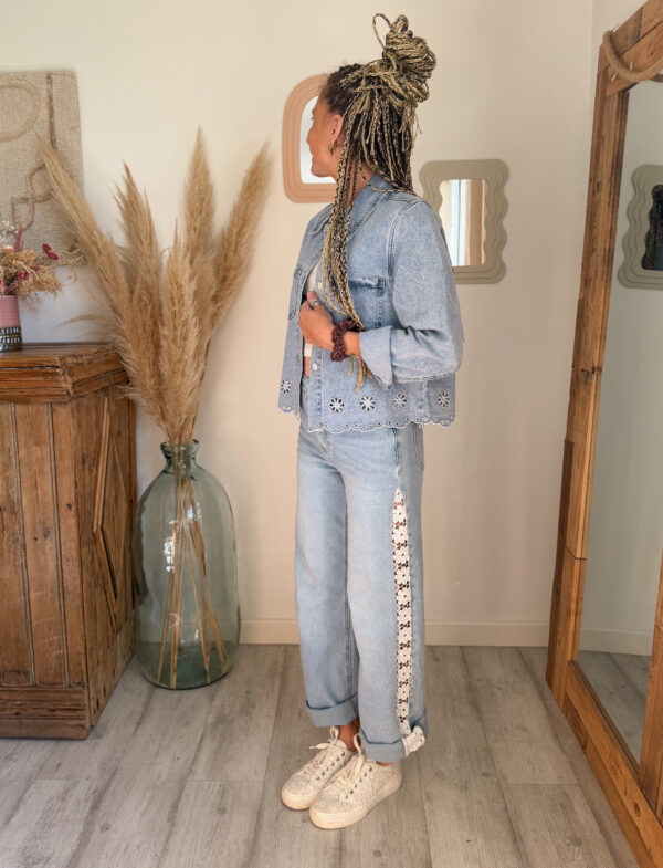 Cette veste jean femme broderie se distingue par ses finitions soignées, notamment ses broderies florales ajourées sur le bas, qui lui donnent un charme unique et une allure légèrement bohème. Contrairement à une veste en jean classique, elle offre une vraie valeur ajoutée grâce à ces détails subtils qui attirent le regard tout en restant faciles à porter au quotidien.