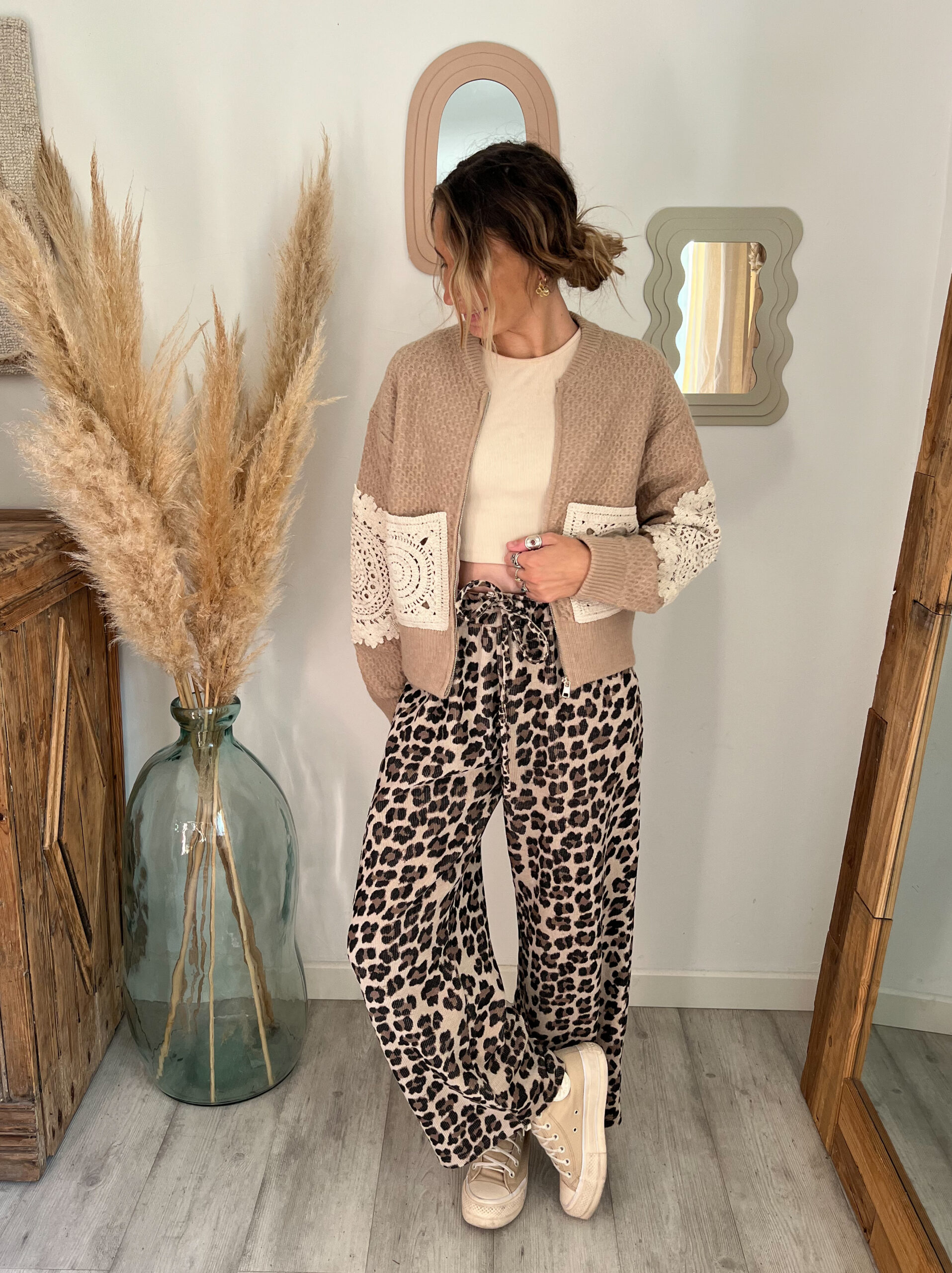 La veste maille beige bohème SAËL se marie à la perfection avec de nombreuses pièces de la boutique : le pantalon SAËL pour un total look doux et coordonné, le pantalon Nayla léopard pour une touche plus audacieuse, ou encore le jean Zoa pour un style casual et moderne.
